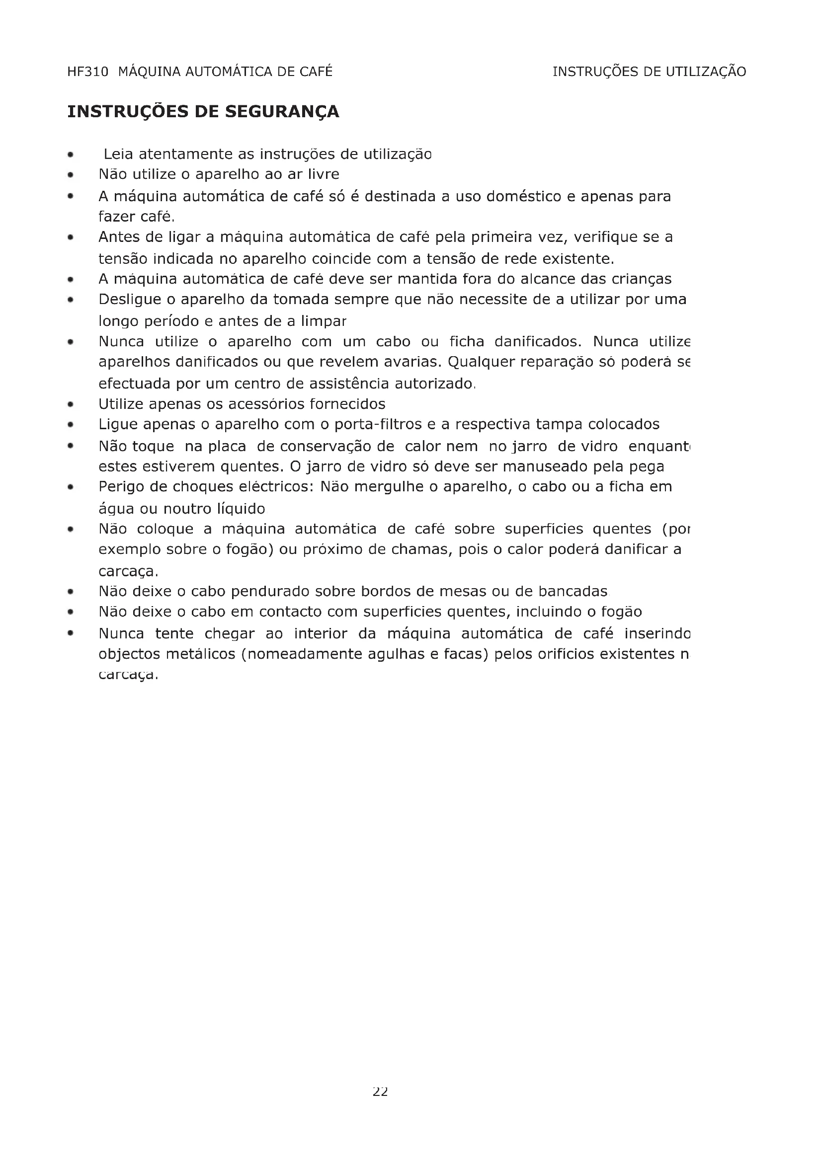 Nunca tente chegar ao interior da máquina automática de café inserindo objectos metálicos (nomeadamente agulhas e facas) pelos orifícios existentes na carcaça. HF310 MÁQUINA AUTOMÁTICA DE CAFÉ
