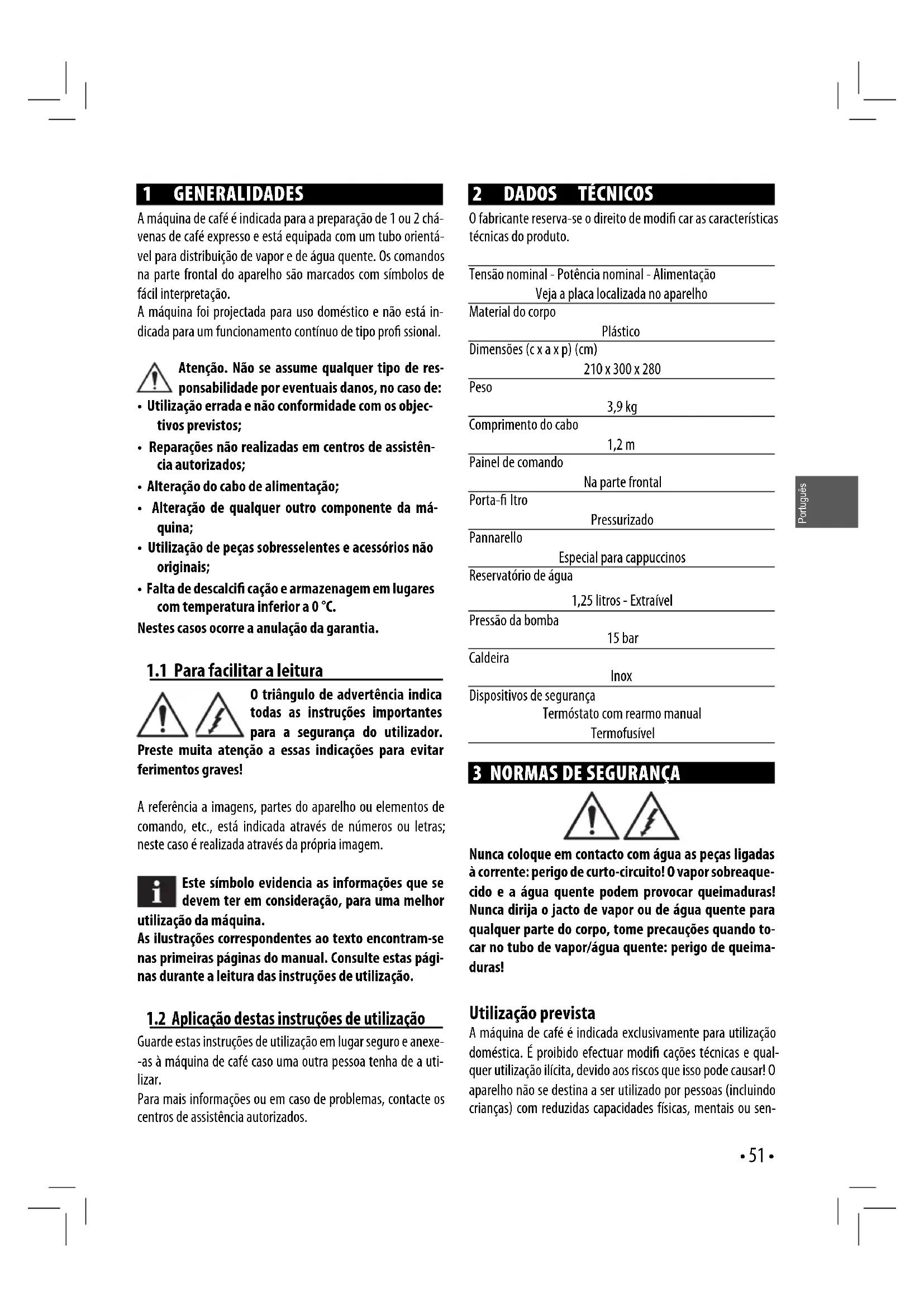 O fabricante reserva-se o direito de modi car as características técnicas do produto. Tensão nominal - Potência nominal - Alimentação Veja a placa localizada no aparelho Material do corpo Plástico Dimensões (c x a x p) (cm) 210 x 300 x 280 Peso 3,9 kg Comprimento do cabo 1,2 m Painel de comando Na parte frontal Porta- ltro Pressurizado Pannarello Especial para cappuccinos Reservatório de água 1,25 litros - Extraível Pressão da bomba 15 bar Caldeira Inox Dispositivos de segurança Termóstato com rearmo manual Termofusível