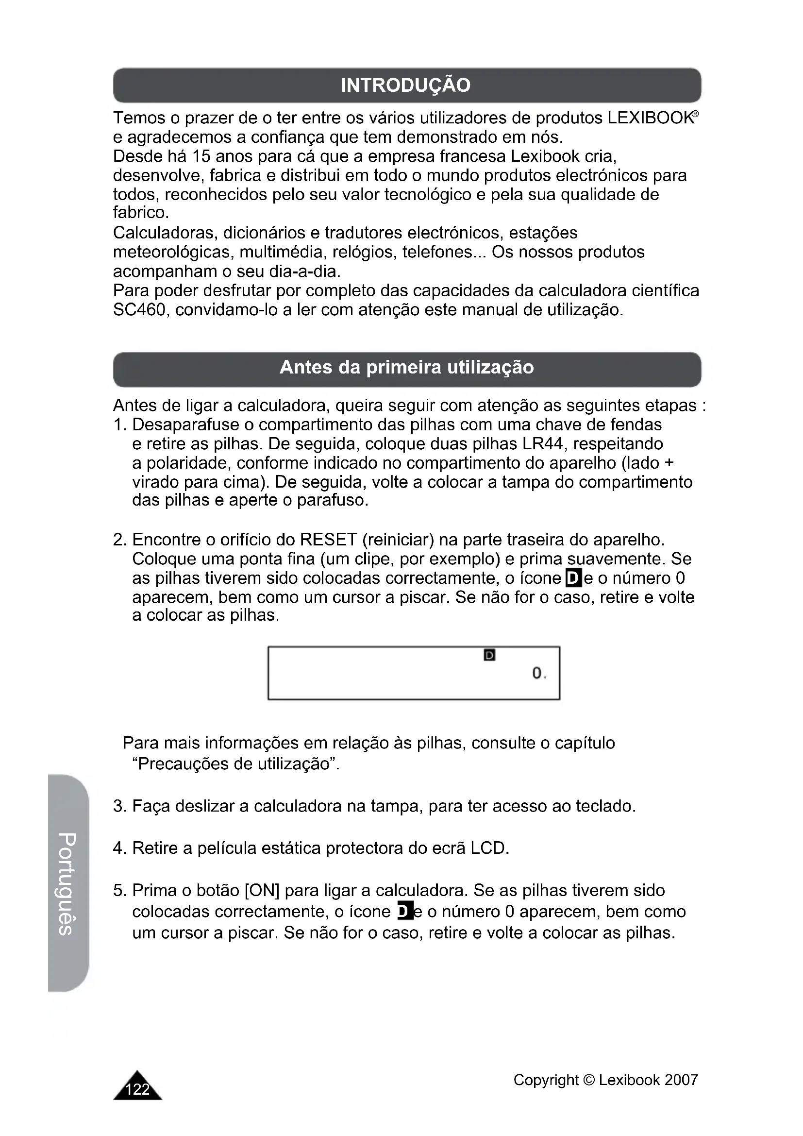 colocadas correctamente, o ícone D e o número 0 aparecem, bem como um cursor a piscar. Se não for o caso, retire e volte a colocar as pilhas.123 Copyright © Lexibook 2007 Português