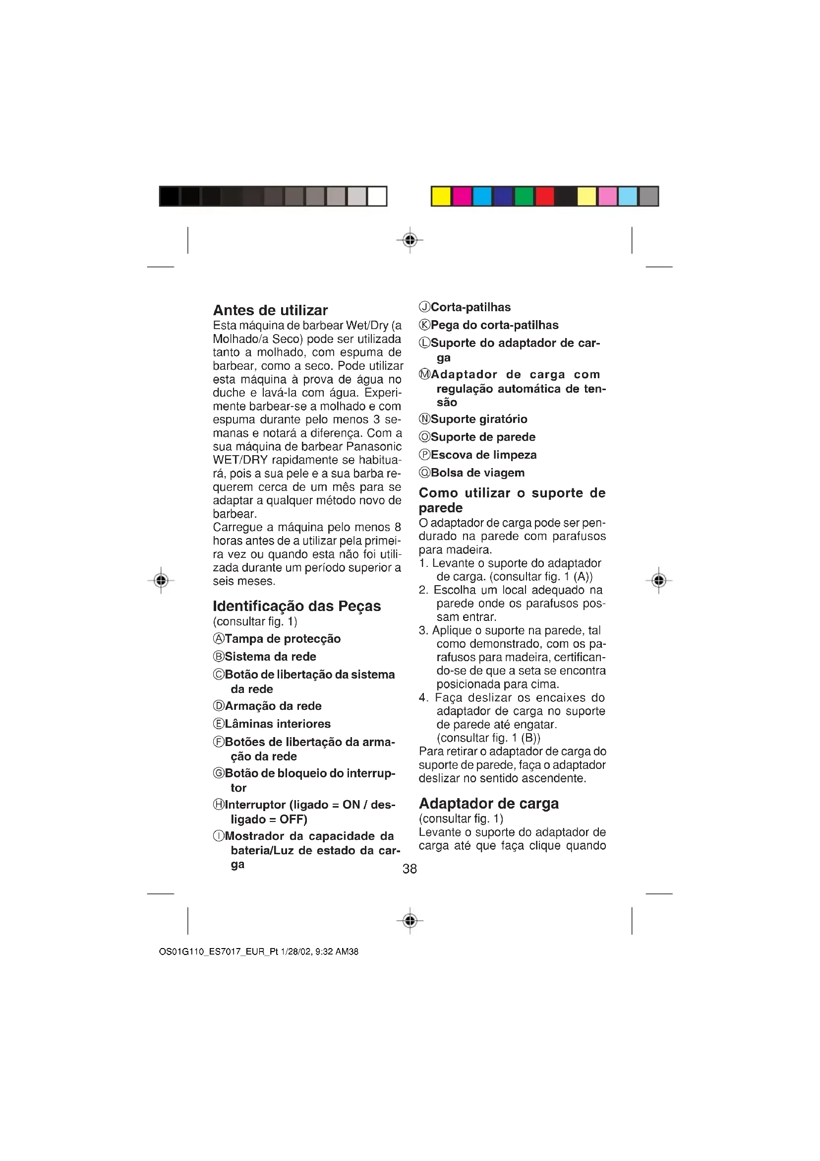 - Benyt altid kun barbermaskinen efter hensigten og som beskrevet i brugervejledningen. Dette produkt er kun til husholdnings- brug. OS01G110_ES7017_EUR_Dk 1/28/02, 9:32 AM3738 Antes de utilizar Esta máquina de barbear Wet/Dry (a Molhado/a Seco) pode ser utilizada tanto a molhado, com espuma de barbear, como a seco. Pode utilizar esta máquina à prova de água no duche e lavá-la com água. Experi- mente barbear-se a molhado e com espuma durante pelo menos 3 se- manas e notará a diferença. Com a sua máquina de barbear Panasonic WET/DRY rapidamente se habitua- rá, pois a sua pele e a sua barba re- querem cerca de um mês para se adaptar a qualquer método novo de barbear. Carregue a máquina pelo menos 8 horas antes de a utilizar pela primei- ra vez ou quando esta não foi utili- zada durante um período superior a seis meses. Identificação das Peças (consultar fig. 1) A Tampa de protecção B Sistema da rede C Botão de libertação da sistema da rede D Armação da rede E Lâminas interiores F Botões de libertação da arma- ção da rede G Botão de bloqueio do interrup- tor H Interruptor (ligado = ON / des- ligado = OFF) I Mostrador da capacidade da bateria/Luz de estado da car-