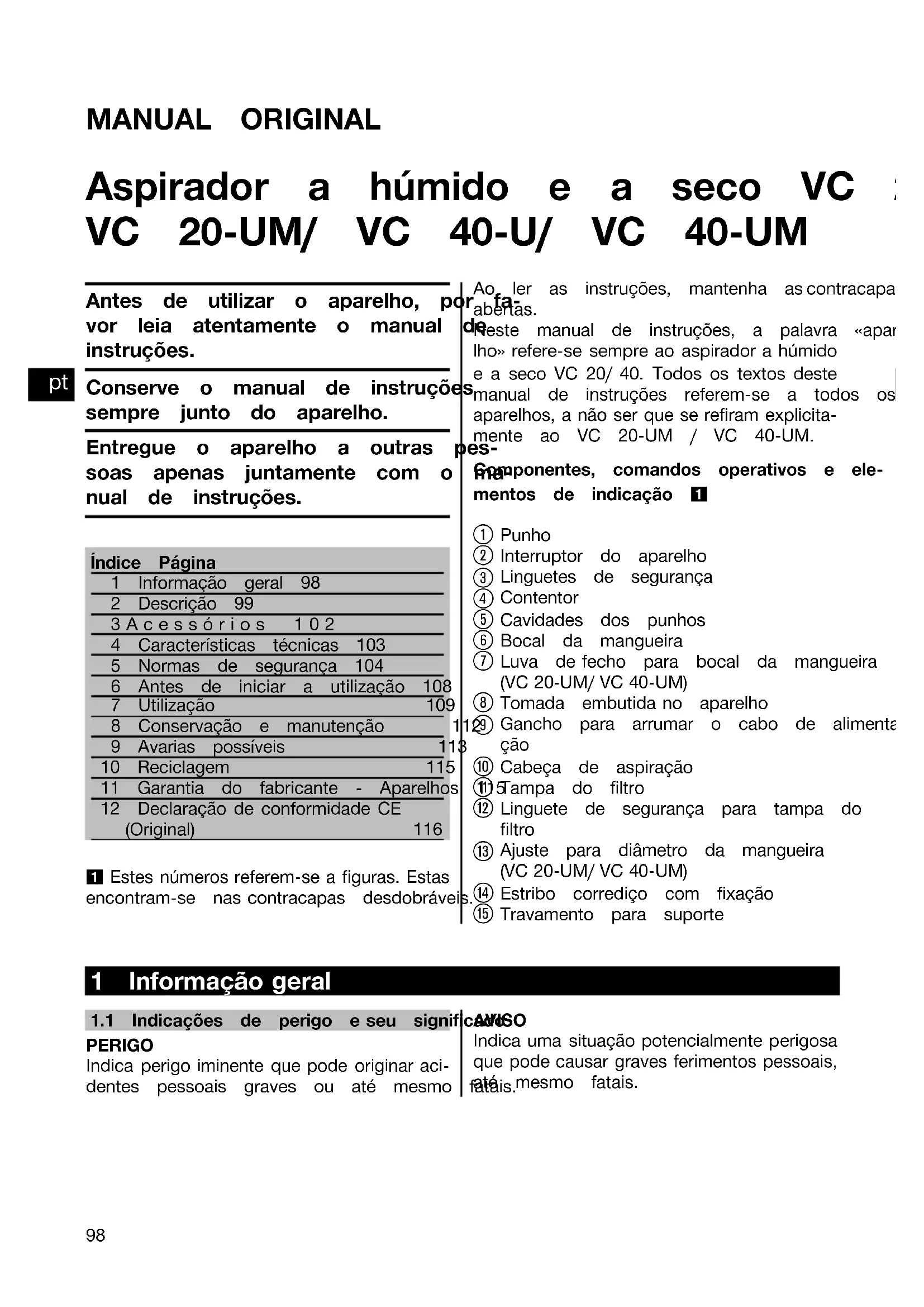 Printed: 08.07.2013 | Doc-Nr: PUB / 5071294 / 000 / 02MANUAL ORIGINAL Aspirador a húmido e a seco VC 20‑U/ VC 20‑UM/ VC 40‑U/ VC 40‑UM Antes de utilizar o aparelho, por fa-vor leia atentamente o manual deinstruções.Conserve o manual de instruçõessempre junto do aparelho.Entregue o aparelho a outras pes-soas apenas juntamente com o ma-nual de instruções.Índice Página1 Informação geral 982 Descrição 993Acessórios 1024 Características técnicas 1035 Normas de segurança 1046 Antes de iniciar a utilização 1087 Utilização 1098 Conservação e manutenção 1129 Avarias possíveis 11310 Reciclagem 11511 Garantia do fabricante - Aparelhos 11512 Declaração de conformidade CE(Original) 116 1 Estes números referem-se a figuras. Estas encontram-se nas contracapas desdobráveis.Ao ler as instruções, mantenha as contracapasabertas.Neste manual de instruções, a palavra «apare- lho» refere-se sempre ao aspirador a húmido e a seco VC 20/ 40. Todos os textos deste manual de instruções referem-se a todos os 4 aparelhos, a não ser que se refiram explicita- mente ao VC 20‑UM / VC 40‑UM.Componentes, comandos operativos e ele-mentos de indicação 1 Punho Interruptor do aparelho Linguetes de segurança Contentor Cavidades dos punhos Bocal da mangueira Luva de fecho para bocal da mangueira (VC20‑UM/VC40‑UM)