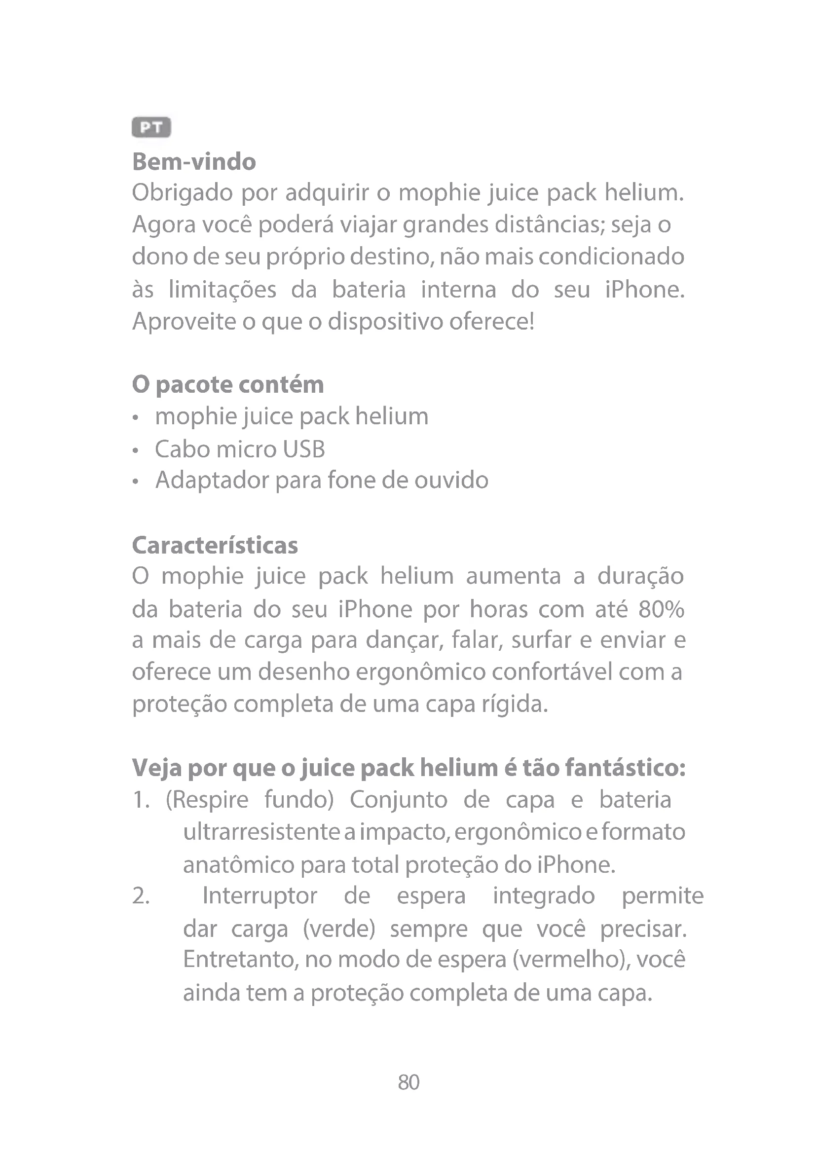 Obrigado por adquirir o mophie juice pack helium. Agora você pode viajar grandes distâncias; está o dono de seuignon, não mais condicionado às limitações da bateria interna do seu iPhone. Aproveite o que o disposito oferece!