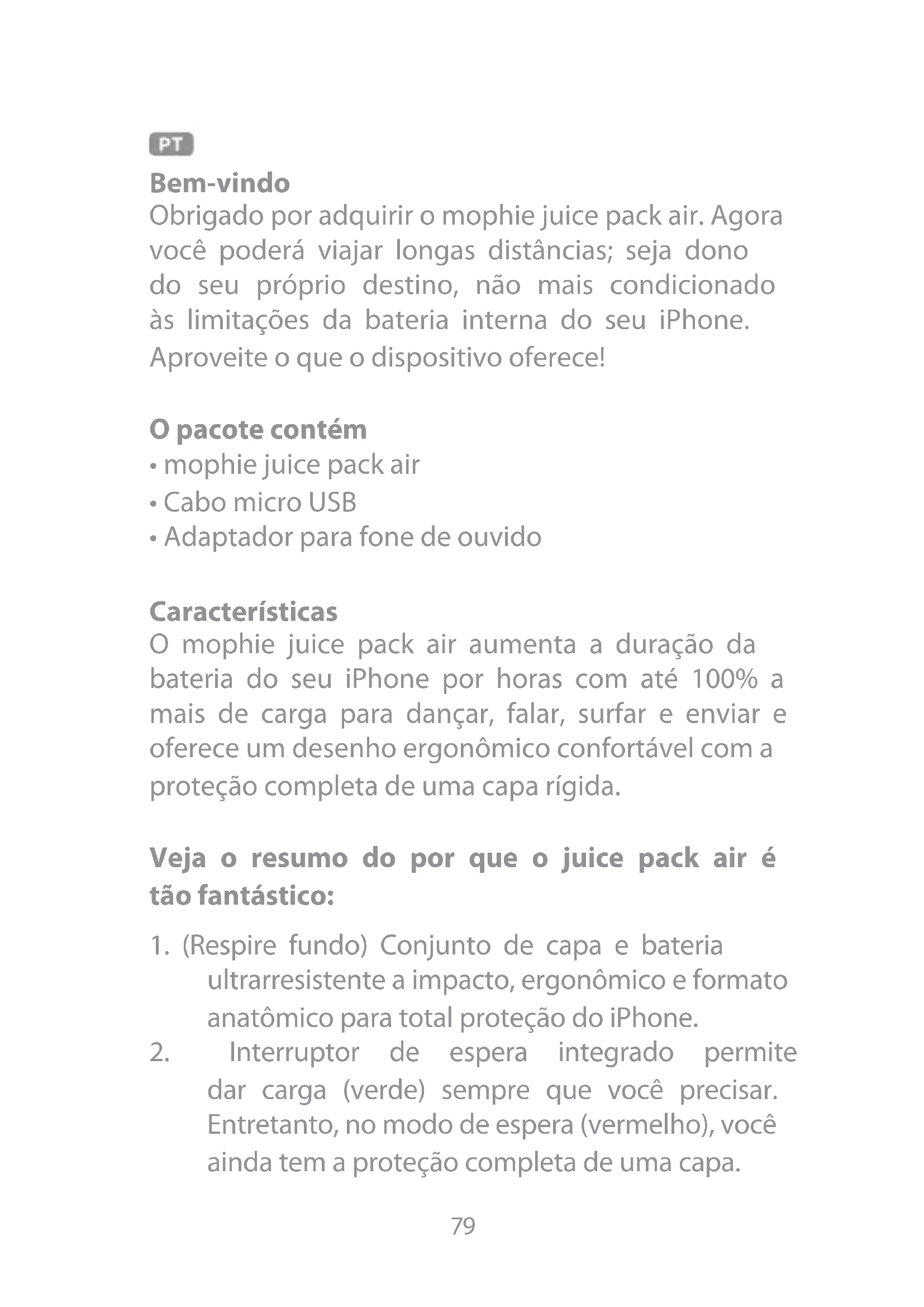 Obrigado por adquirir o mophie juice pack air. Agora você pode viajar longas distâncias; está dono do seuignon, não mais condicionado às limitações da bateria interna do seu iPhone. Aproveite o que o disposito oferece!