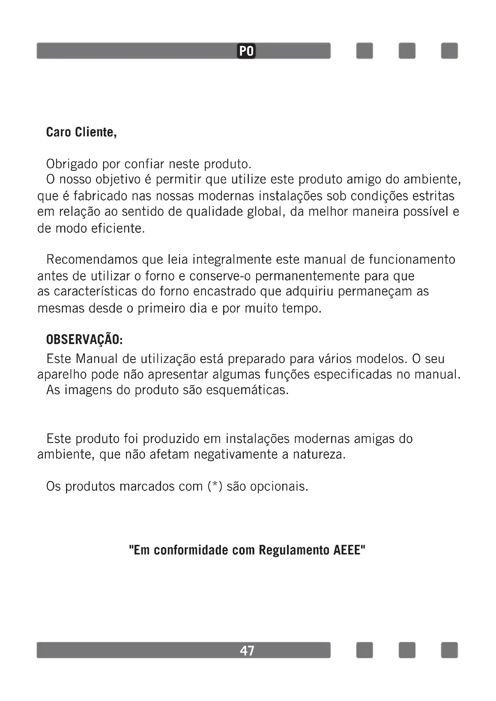 Caro Cliente, Obrigado por confiar neste produto. O nosso objetivo é permitir que utilize este produto amigo do ambiente, que é fabricado nas nossas modernas instalações sob condições estritas em relação ao sentido de qualidade global, da melhor maneira possível e de modo eficiente. Recomendamos que leia integralmente este manual de funcionamento antes de utilizar o forno e conserve-o permanentemente para que as características do forno encastrado que adquiriu permaneçam as mesmas desde o primeiro dia e por muito tempo. OBSERVAÇÃO: Este Manual de utilização está preparado para vários modelos. O seu aparelho pode não apresentar algumas funções especificadas no manual. As imagens do produto são esquemáticas. Este produto foi produzido em instalações modernas amigas do ambiente, que não afetam negativamente a natureza. Os produtos marcados com (*) são opcionais. "Em conformidade com Regulamento AEEE" PO48 ÍNDICE Avisos Importantes