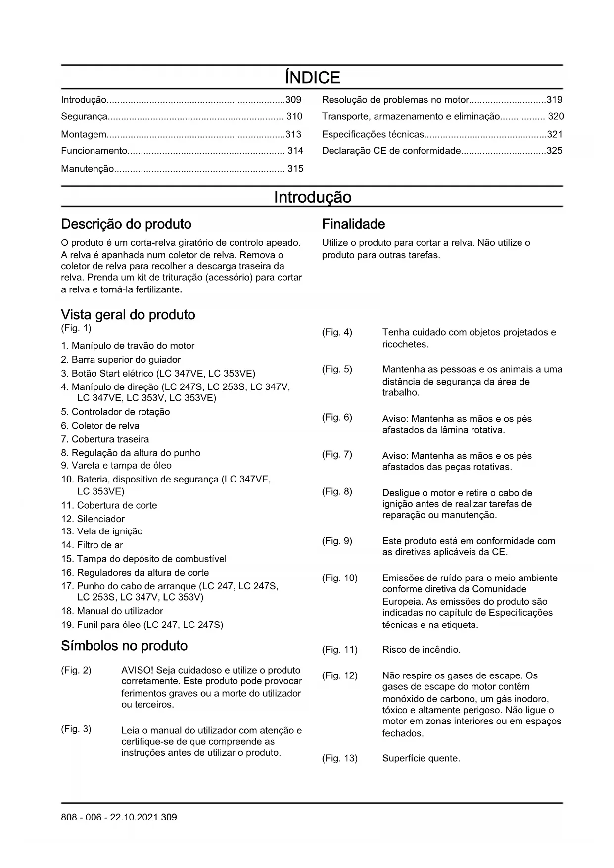 Símbolos no produto (Fig. 2) AVISO! Seja cuidadoso e utilize o produto corretamente. Este produto pode provocar ferimentos graves ou a morte do utilizador ou terceiros. (Fig. 3) Leia o manual do utilizador com atenção e certifique-se de que compreende as instruções antes de utilizar o produto. (Fig. 4) Tenha cuidado com objetos projetados e ricochetes. (Fig. 5) Mantenha as pessoas e os animais a uma distância de segurança da área de trabalho. (Fig. 6) Aviso: Mantenha as mãos e os pés afastados da lâmina rotativa. (Fig. 7) Aviso: Mantenha as mãos e os pés afastados das peças rotativas. (Fig. 8) Desligue o motor e retire o cabo de ignição antes de realizar tarefas de reparação ou manutenção. (Fig. 9) Este produto está em conformidade com as diretivas aplicáveis da CE. (Fig. 10) Emissões de ruído para o meio ambiente conforme diretiva da Comunidade Europeia. As emissões do produto são indicadas no capítulo de Especificações técnicas e na etiqueta. (Fig. 11) Risco de incêndio. (Fig. 12) Não respire os gases de escape. Os gases de escape do motor contêm monóxido de carbono, um gás inodoro, tóxico e altamente perigoso. Não ligue o motor em zonas interiores ou em espaços fechados. (Fig. 13) Superfície quente.