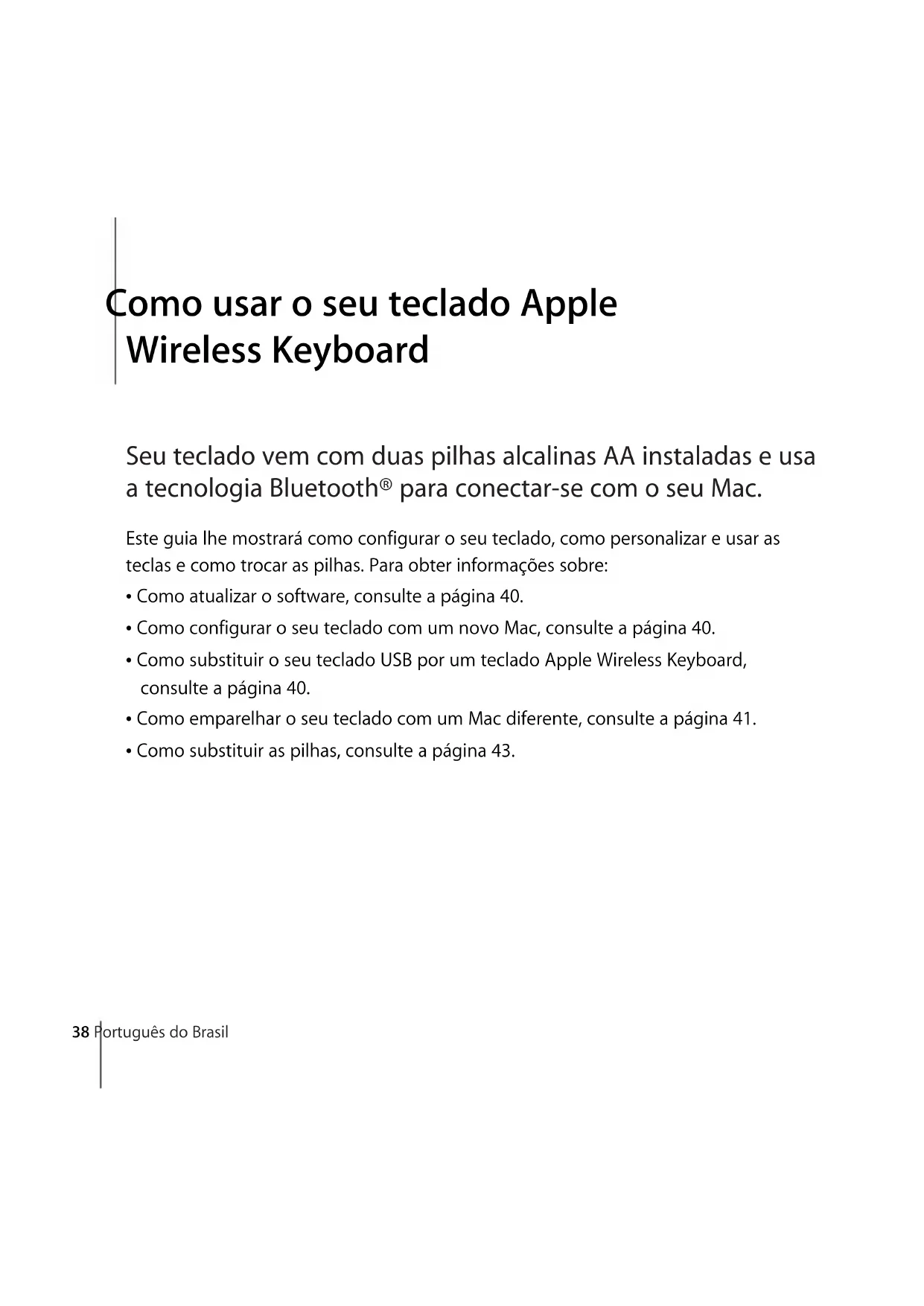 Mantenga pulsada la tecla de expulsión de discos para expulsar un disco.Español 35 Sustitución de las pilas El teclado inalámbrico Apple Wireless Keyboard viene con dos pilas alcalinas de tamaño AA. Puede cambiarlas tanto por pilas alcalinas como por pilas de litio o pilas AA recargables. Importante: Mantenga la tapa del compartimento de las pilas y las pilas fuera del alcance de los niños. Para sustituir las pilas: 1 Pulse el botón de encendido/apagado (®) para apagar el teclado. 2 Con la ayuda de una moneda, extraiga la tapa del compartimento de las pilas. 3 Introduzca dos pilas AA en el compartimento de las pilas tal como se muestra en la imagen. Tapa del compartimento de las pilas Introduzca las pilas36 Español 4 Vuelva a colocar la tapa del compartimento de las pilas. Para comprobar el estado de las pilas, pulse el botón de encendido/apagado (®). Si el indicador luminoso no se ilumina, es posible que deba cambiar o recargar las pilas. Puede comprobar el nivel de carga de las pilas en el panel de preferencias Teclado. Seleccione Apple () > “Preferencias del Sistema” y haga clic en Teclado. El nivel de carga de las pilas se muestra en la esquina inferior izquierda de la ventana. Para prolongar la duración de las pilas, apague el teclado cuando no lo utilice. Tire las pilas siguiendo la normativa ambiental aplicable en su municipio. ADVERTENCIA: Cuando sea necesario cambiar las pilas, sustituya siempre todas y no mezcle pilas nuevas con viejas ni tipos de pilas distintos (por ejemplo, no mezcle pilas alcalinas con pilas de litio). No intente abrir ni perforar las pilas, no las coloque al revés y evite que entren en contacto con el fuego, con altas temperaturas o con el agua. Mantenga las pilas fuera del alcance de los niños.Español 37 Limpieza del teclado Siga estas instrucciones para limpiar la parte exterior de su teclado: Â Extraiga las pilas del teclado. Â Utilice un paño suave y húmedo para limpiar el exterior del teclado. Evite que entre agua o humedad por las aberturas. Â No utilice aerosoles, disolventes ni limpiadores abrasivos. Ergonomía Para obtener más información sobre ergonomía, salud y seguridad, visite la página web de Apple sobre ergonomía: www.apple.com/es/about/ergonomics. Soporte Para obtener información sobre soporte y resolución de problemas, acceder a foros de discusión de usuarios y descubrir las últimas novedades en descargas de software de Apple, visite www.apple.com/es/support.38 Português do Brasil 1 Como usar o seu teclado Apple Wireless Keyboard Seu teclado vem com duas pilhas alcalinas AA instaladas e usa a tecnologia Bluetooth® para conectar-se com o seu Mac. Este guia lhe mostrará como configurar o seu teclado, como personalizar e usar as teclas e como trocar as pilhas. Para obter informações sobre: Â Como atualizar o software, consulte a página 40. Â Como configurar o seu teclado com um novo Mac, consulte a página 40. Â Como substituir o seu teclado USB por um teclado Apple Wireless Keyboard, consulte a página 40. Â Como emparelhar o seu teclado com um Mac diferente, consulte a página 41. Â Como substituir as pilhas, consulte a página 43.Português do Brasil 39 Sobre o Indicador Luminoso O indicador luminoso do seu teclado Apple Wireless Keyboard funciona como um indicador da bateria e como um indicador luminoso de estado. Quando você ligar seu teclado pela primeira vez, a luz se acenderá por 5 segundos para indicar que as pilhas estão em boas condições. Depois de 5 segundos, se o seu teclado não for emparelhado com o seu Mac, a luz começará a piscar para indicar que o seu teclado está no modo visível e que está preparado para realizar o emparelhamento com o seu Mac (emparelhamento significa que o seu teclado e o seu Mac estão conectados sem fios e preparados para comunicar-se entre si). Se você não emparelhar o seu teclado com o seu Mac em 3 minutos, o indicador luminoso e o teclado serão desligados para preservar a vida útil das pilhas. Pressione e solte o botão Ligar/desligar (®) para ligar novamente o seu teclado, permitindo que você o emparelhe com o seu Mac (consulte a página 40). Depois que você emparelhar o seu teclado com o seu Mac de forma satisfatória, o indicador luminoso se acenderá por 3 segundos e depois se apagará. Se você pressionar o botão Ligar/desligar (®) e a luz não se acender, talvez você necessite pilhas novas ou carregadas. Botão Ligar/desligar Indicador luminoso40 Português do Brasil Como atualizar o seu Software Para usar o seu teclado e a gama completa de recursos que ele oferece, atualize o seu Mac para a versão 10.5.8 ou posterior do Mac OS X e instale o software mais recente do teclado. Para atualizar para a última versão do Mac OS X, escolha Apple () > Atualização de Software na barra de menus e siga as instruções da tela. Quando a instalação for concluída e você tiver reiniciado o seu Mac, use a Atualização de Software novamente para certificar-se de que todas as atualizações disponíveis foram instaladas. Como configurar um novo teclado sem fio e um novo Mac Siga as instruções do manual de usuário que veio com o seu Mac para configurá-lo. Como você possui um teclado sem fio, ignore as instruções sobre como conectar um teclado USB. Para emparelhar seu teclado sem fio com um novo Mac: 1 Pressione e solte o botão Ligar/desligar (®) para ligar o seu teclado. 2 Ligue o seu Mac e siga as instruções do Assistente de Configuração na tela. Como substituir um teclado USB por um teclado Apple Wireless Keyboard Use o seu teclado USB existente e o Assistente de Configuração Bluetooth para emparelhar o seu teclado Apple Wireless Keyboard com o seu Mac. Você também pode usar estas instruções para configurar o seu teclado sem fio com um Mac portátil.Português do Brasil 41 Para configurar o seu teclado sem fio: 1 Pressione e solte o botão Ligar/desligar (®) para ligar o seu teclado sem fio. 2 Escolha Apple () > Preferê