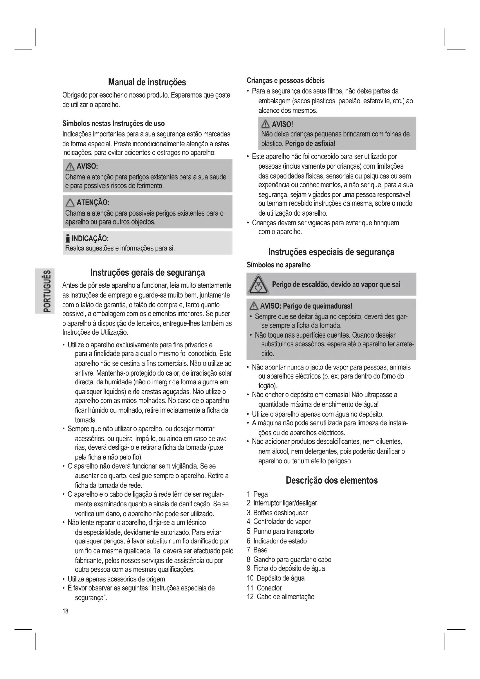 - Crianças devem ser vigiadas para evitar que brinquem com o aparelho. Instruções especiais de segurança Símbolos no aparelho Perigo de escaldão, devido ao vapor que sai AVISO: Perigo de queimaduras!