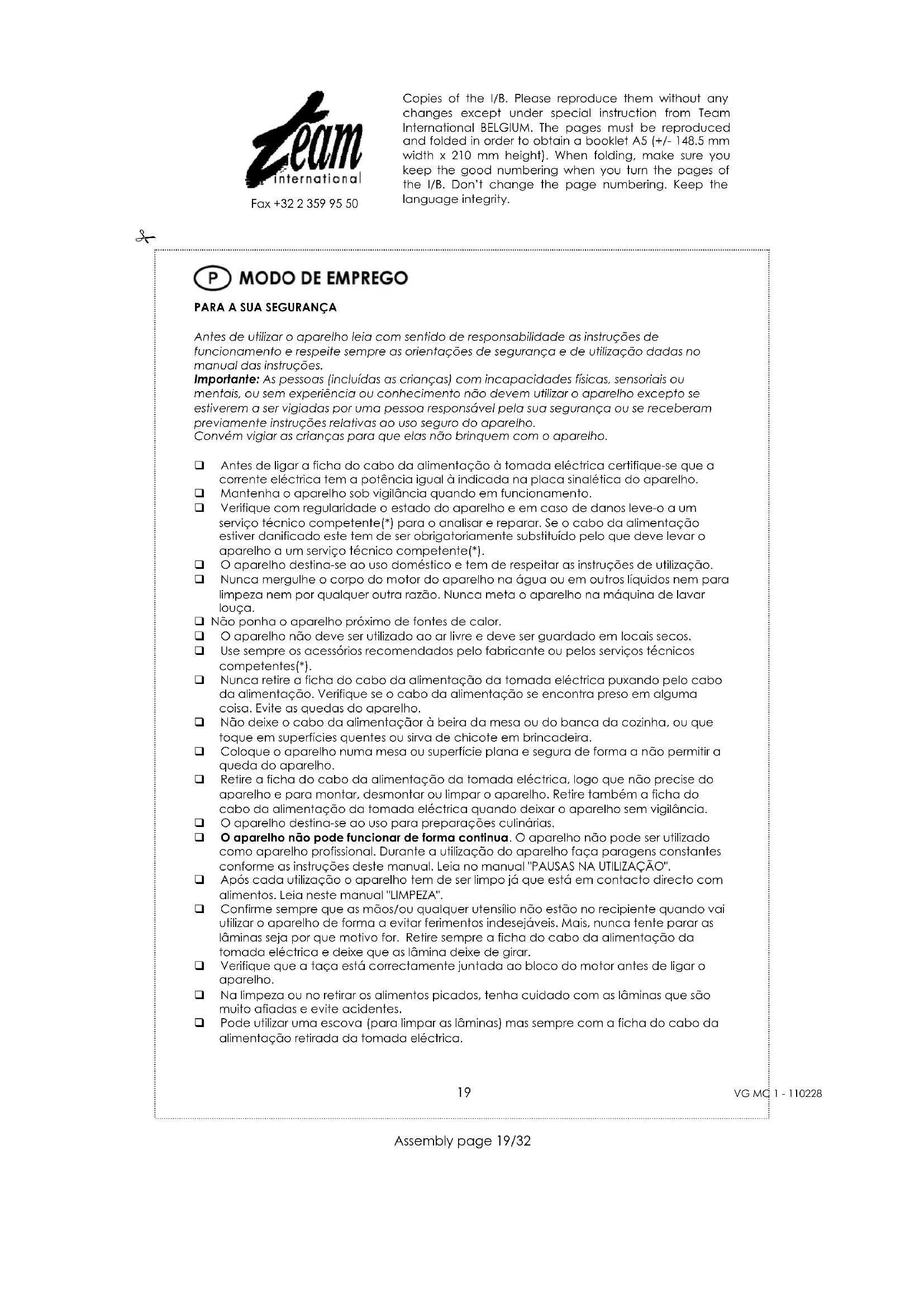 - Limpe o Bloco do motor com um esfregao ligeiramente humido. Nunca vergulhe o corpo do motor em agua ou outros liquidos. Se acontecese, refire a ficha do cabo da alimentacao da toma de electrica eaxe o bloco do motor secar durante 24 h pelos menos antes de voltar autilizar o aparelho. Se o aparelho nao funcionalo deposite este tempo, leve-o a um service Tecnico habilhado.