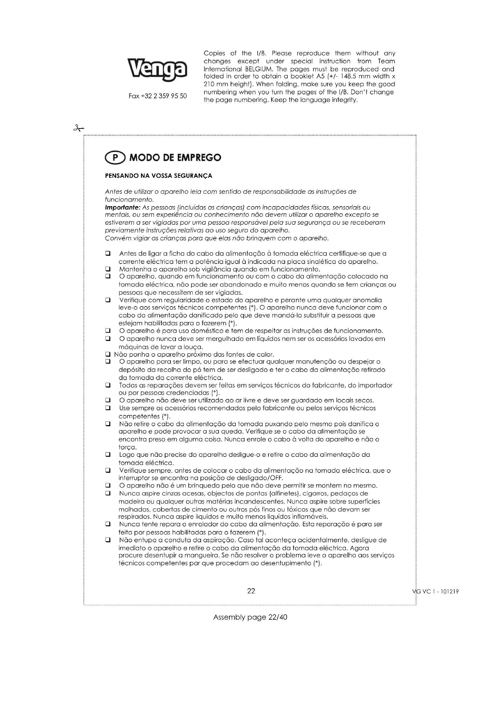 Assembly page 22/40 Copies of the I/B. Please reproduce them without any changes except under special instruction from Team International BELGIUM. The pages must be reproduced and folded in order to obtain a booklet A5 (+/- 148.5 mm width x 210 mm height). When folding, make sure you keep the good numbering when you turn the pages of the I/B. Don’t change the page numbering. Keep the language integrity. Fax +32 2 359 95 50 Nunca vire o bocal da aspiração para as pessoas ou animais e muito menos para os olhos ou as orelhas. Verifique com regularidade o estado dos filtros e do depósito para recolha do pó. O funcionamento do aparelho com o depósito do pó cheio e/ou com os filtros sujos provoca danos irreparáveis no aparelho. Caso o aparelho deixe de aspirar com normalidade desligue-o e retire o cabo da alimentação da tomada eléctrica. Despeje o depósito do pó, verifique o estado dos filtros e verifique se a mangueira não se encontra entupida. (*) Serviço técnico habilitado: serviço técnico do fabricante ou importador duma pessoa qualificada, reconhecida e habilitada para evitar qualquer perigo. Em casos de avaria contacte o estabelecimento onde comprou o aparelho. A garantia não cobre os danos com origem na má utilização: funcionamento do aparelho com o depósito do pó cheio, filtros sujos ou mal colocados ou mesmo ausência dos mesmos, mangueira de aspiração entupida, quedas,…