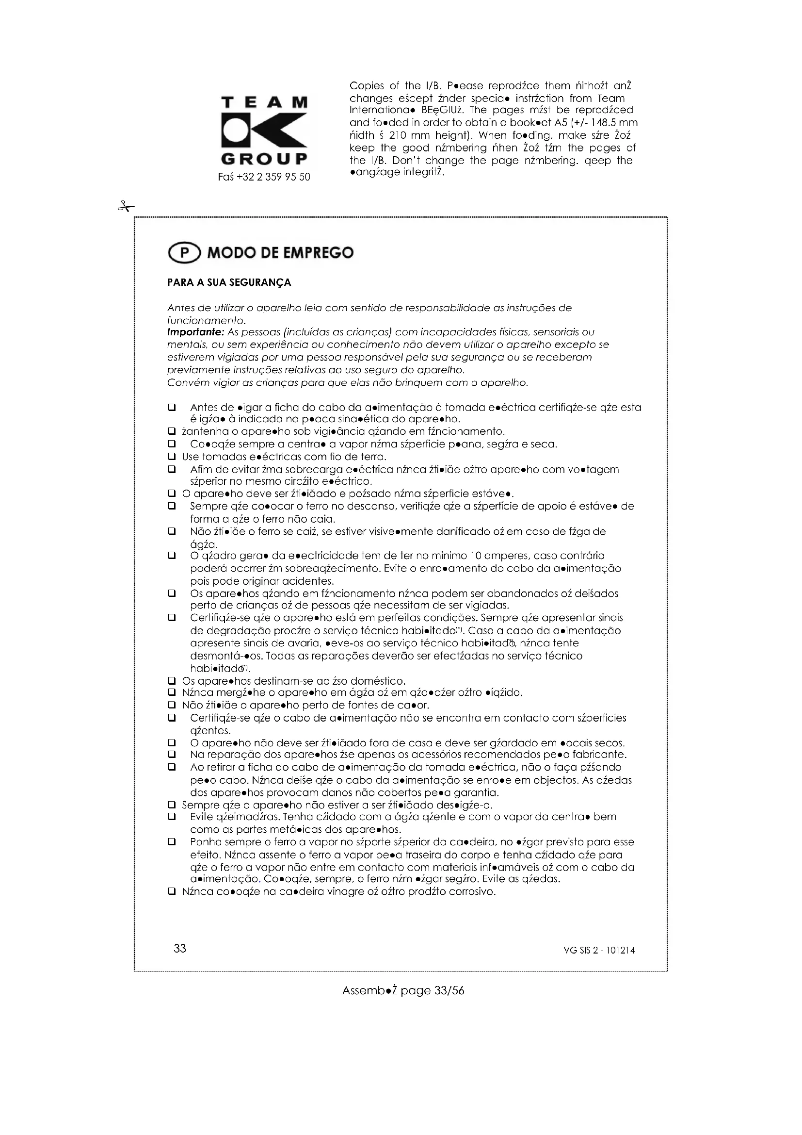 Fax +32 2 359 95 50 Antes da primeira utilização retire a protecção que protege a base e limpe-a com um pano seco e macio. O ferro contém certas substâncias que na primeira utilização podem provocar fumos que desaparecem com o tempo de aquecimento. O ferro deve ser utilizado e pousado numa superfície estável. Não utilize o ferro se caiu, se estiver visivelmente danificado ou em caso de fuga de água. Quando ponha o ferro no suporte (se for o modelo do aparelho), verifique se a superfície na qual está colocado o suporte é estável. Proceda da mesma forma se o reservatório da água deixar de funcionar o estiver danificado. Para evitar choques eléctricos não tente desmontar nem o ferro nem o reservatório da água: leve o aparelho a um técnico credenciado. Um arranjo ou desmontagem e montagem incorrecta pode provocar choques eléctricos assim que se ligue o ferro ou o depósito da água. Desenrole completamente o cabo da alimentação bem como o tubo da alimentação antes de colocar em funcionamento o aparelho. Antes de retirar a ficha do cabo da alimentação da tomada eléctrica coloque o interruptor da central a vapor na posição desligado “0”. Antes de limpar ou arrumar o aparelho, e se a caldeira estiver sobre pressão (dependendo do modelo) antes de abrir, encher ou despejar o reservatório da água, a central a vapor tem de estar com a ficha do cabo da alimentação retirada da tomada eléctrica e fria. SE A CALDEIRA ESTIVER SOBRE PRESSÃO (DEPENDENDO DO MODELO), NUNCA ABRA O DEPÓSITO DA ÁGUA DA CALDEIRA COM O APARELHO EM FUNCIONAMENTO E MUITO MENOS DURANTE A PRODUÇÃO DO VAPOR.