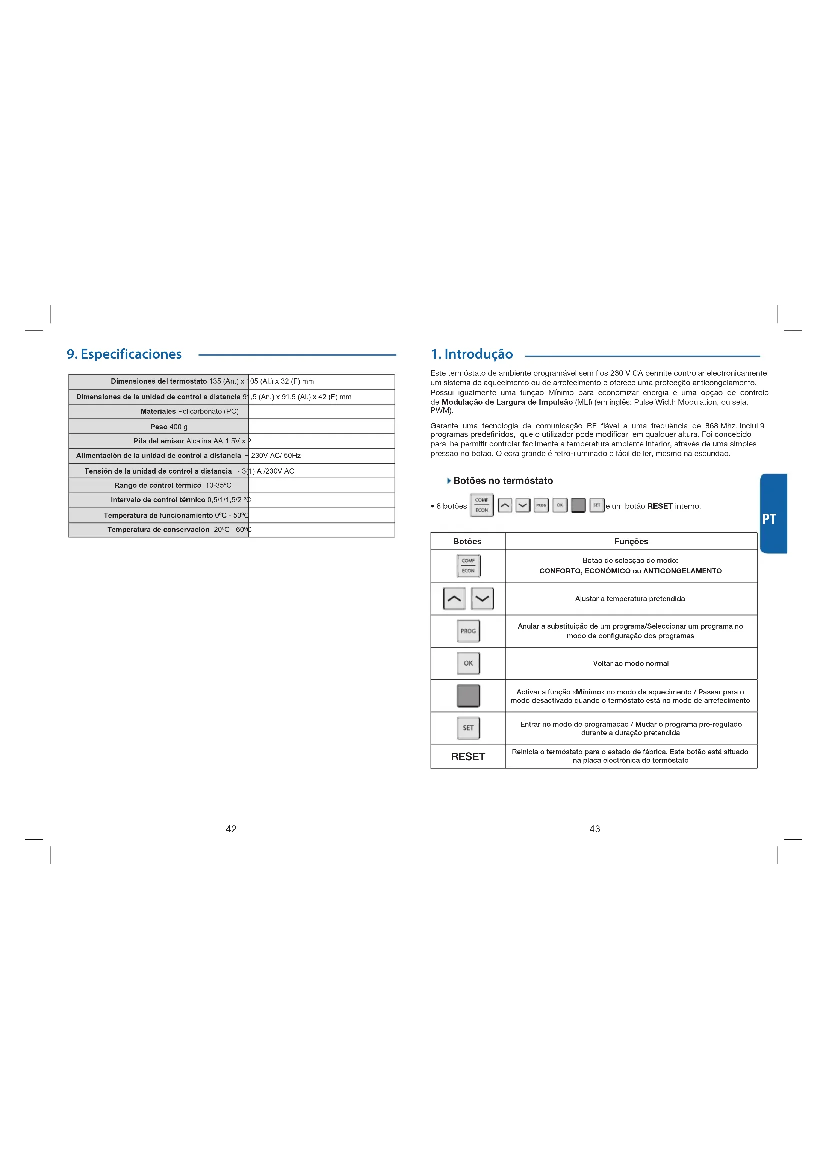 Dimensiones del termostato 135 (An.) x 105 (Al.) x 32 (F) mm Dimensiones de la unidad de control a distancia 91,5 (An.) x 91,5 (Al.) x 42 (F) mm Materiales Policarbonato (PC)Peso 400 gPila del emisor Alcalina AA 1.5V x 2Alimentación de la unidad de control a distancia ~ 230V AC/ 50HzTensión de la unidad de control a distancia ~ 3(1) A /230V ACRango de control térmico 10-35ºCIntervalo de control térmico 0,5/1/1,5/2 ºCTemperatura de funcionamiento 0ºC - 50ºCTemperatura de conservación -20ºC - 60ºC Este termóstato de ambiente programável sem fios 230 V CA permite controlar electronicamente um sistema de aquecimento ou de arrefecimento e oferece uma protecção anticongelamento. Possui igualmente uma função Mínimo para economizar energia e uma opção de controlo de Modulação de Largura de Impulsão (MLI) (em inglês: Pulse Width Modulation, ou seja, PWM). Garante uma tecnologia de comunicação RF fiável a uma frequência de 868 Mhz. Inclui 9 programas predefinidos, que o utilizador pode modificar em qualquer altura. Foi concebido para lhe permitir controlar facilmente a temperatura ambiente interior, através de uma simples pressão no botão. O ecrã grande é retro-iluminado e fácil de ler, mesmo na escuridão.