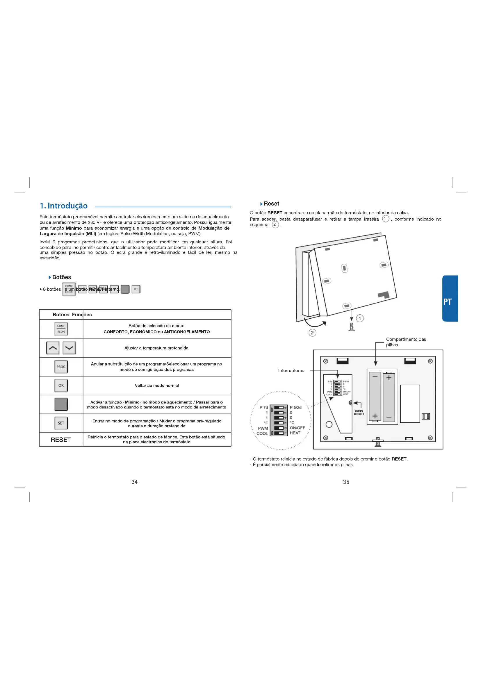 InterruptoresCompartimento das pilhasBotão - O termóstato reinicia no estado de fábrica depois de premir o botão RESET. - É parcialmente reiniciado quando retirar as pilhas.36