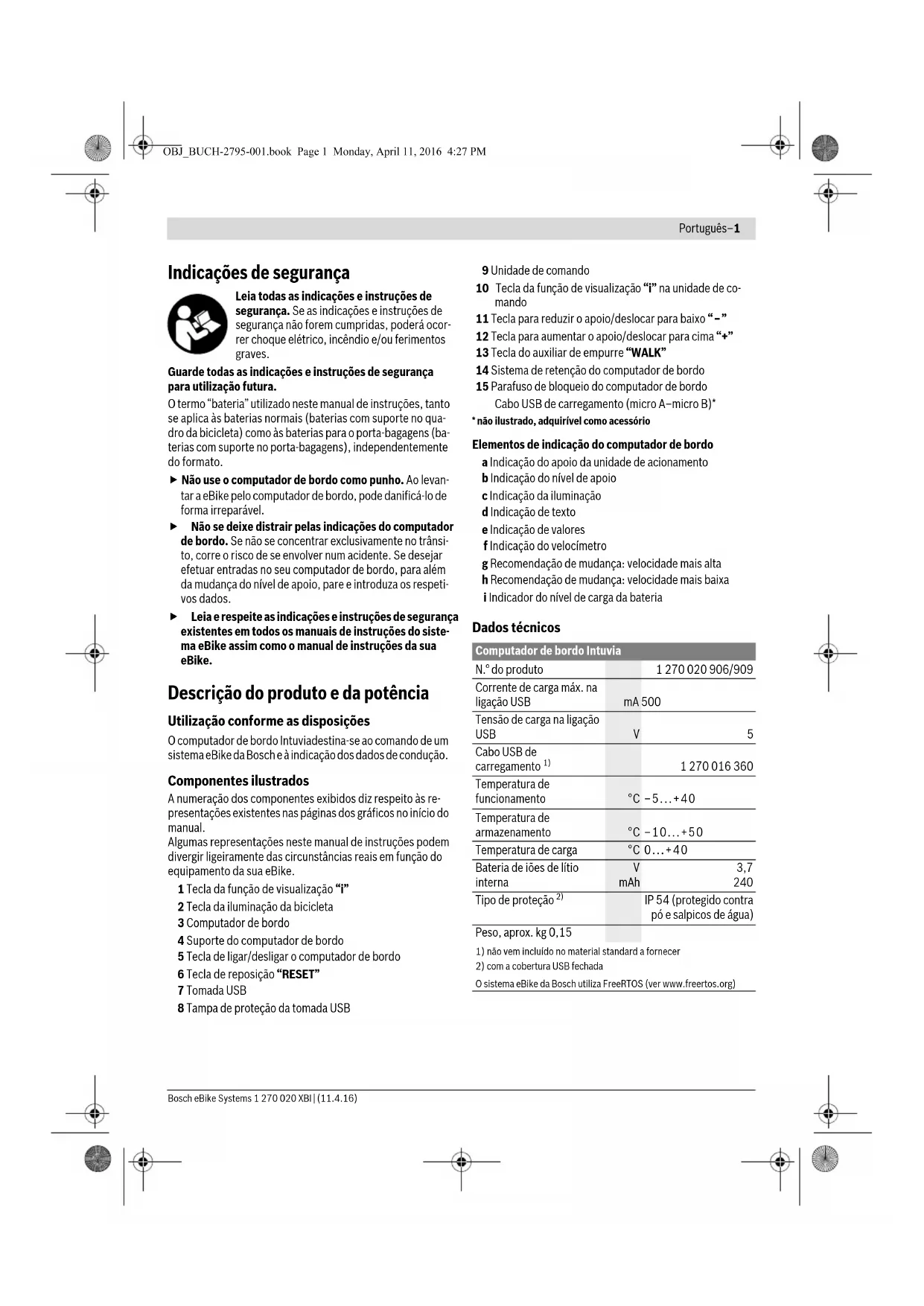 Erro de temperatura da bateria durante o processo de carga Separe o carregador da bateria. Deixe a bateria arrefecer. Se o problema persistir, entre em contacto com o seu agente autorizado eBike da Bosch. 606 Erro externo da bateria Verifique a cablagem. Reinicie o sistema. Se o problema persistir, entre em contacto com o seu agente autorizado eBike da Bosch. Código Causa Solução OBJ_BUCH-2795-001.book Page 7 Monday, April 11, 2016 4:27 PMPortuguês–8 1 270 020 XBI | (11.4.16) Bosch eBike Systems Abastecimento de energia de aparelhos externos através da ligação USB Com ajuda da conexão USB é possível operar e carregar a maioria dos aparelhos que podem ser alimentados com ener- gia através de USB (p.ex. diversos telefones móveis). O pré-requisito para o carregamento é que estejam montados na eBike o computador de bordo e uma bateria com carga su- ficiente. Abra a tampa de proteção 8 da ligação USB no computador de bordo. Conecte a ligação USB do aparelho externo à tomada USB 7 do computador de bordo através de um cabo USB de carregamento micro A–micro B (disponível junto do seu agente autorizado eBike da Bosch). Depois de desligado o consumidor, a ligação USB tem de ser novamente fechada cuidadosamente com a tampa de proteção 8. Uma conexão USB não é uma ligação de encaixe à prova de água. Nos trajetos com chuva, não pode ficar conecta- do qualquer aparelho externo e a ligação USB tem de es- tar completamente fechada com a tampa de proteção 8. Manutenção e serviço Manutenção e limpeza Todos os componentes, incluindo o motor, não podem ser mergulhados em água nem limpos com água sob pressão. Para a limpeza do seu computador de bordo use apenas um pano humedecido com água. Não utilize produtos de limpeza. Mande efetuar uma inspeção técnica pelo menos uma vez por ano no seu sistema eBike (entre outras, sistema mecânico, atualidade do software do sistema). O fabricante de bicicletas ou o agente autorizado pode adicio- nalmente basear a data de serviço numa determinada quilo- metragem e/ou período de tempo. Neste caso, após cada liga- ção, o computador de bordo irá informá-lo a esse respeito durante 4 s, quando vencer a data de serviço, na indicação de texto d com “Service”. Para assistência técnica e reparações na eBike contacte um agente autorizado. Serviço pós-venda e consultoria de aplicação Se tiver questões sobre o sistema eBike e respetivos compo- nentes, contacte um agente autorizado. Pode consultar os dados de contacto de agentes autorizados na página de Internet www.bosch-ebike.com