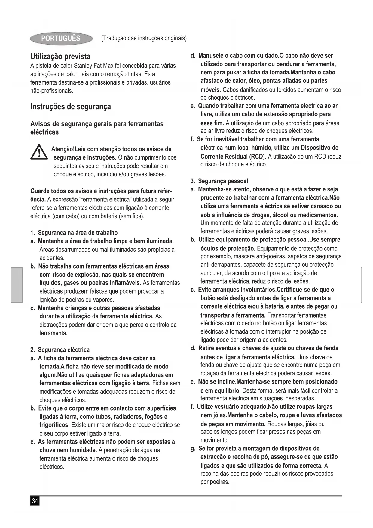 Montagem Atenção! Antes da montagem, certique-se de que a fer- ramenta está desligada e que não está ligada à corrente eléctrica. Montagem de acessórios (g. C, D, E & F) Poderá obter um conjunto de acessórios seleccionados junto do seu revendedor local. w Bocal cónico (5): Concentra o uxo de ar numa área mais restrita. w Cauda de peixe (6): Espalha o uxo de ar por uma área mais vasta w Bocal reector (7): Para soldagem de tubos. w Protector de vidro (8): Para proteger vidro durante a remoção de tinta. w Raspador (9&10): Para remover tinta e verniz. u Encaixe a peça de ligação do acessório sobre o bocal (2).37 (Tradução das instruções originais) PORTUGUÊS Utilização Denição da temperatura (g. A) u Para aumentar a regulação da temperatura, rode o inter- ruptor de controlo de calor (2) no sentido horário. u Para reduzir a regulação da temperatura, rode o interrup- tor de controlo de calor no sentido anti-horário. Ligar e desligar u Para ligar a ferramenta na velocidade de ar lenta e baixo nível de calor, coloque o interruptor ligar/desligar na posição I. u Para ligar a ferramenta na velocidade de ar rápida e alto nível de calor, coloque o interruptor ligar/desligar na posição II. u Para desligar a ferramenta, coloque o interruptor ligar/ desligar na posição O. Utilização da ferramenta Para sua segurança, a ferramenta encontra-se equipada com um termóstato.A utilização contínua da ferramenta durante longos períodos de tempo ou noutros ciclos de funcionamento severos poderá provocar o sobreaquecimento e avaria da mesma.Recomenda-se por isso que permita o arrefecimento da ferramenta a intervalos regulares durante a utilização. u Antes da utilização da ferramenta, aguarde alguns segun- dos para permitir o seu aquecimento. u Na primeira utilização pode ser emitido algum fumo através do bocal.Trata-se de uma situação normal que diminuirá pouco depois. u Utilize uma denição de temperatura baixa para secar tinta e verniz, remover rótulos, encolher canos de isola- mento e descongelar tubos congelados. u Utilize uma denição de temperatura média para derreter plásticos, dobrar tubos de plástico e soltar porcas e parafusos apertados. u Utilize uma denição de temperatura elevada para remover tintas e vernizes e soldar juntas de tubagens. u Se tiver dúvidas acerca da utilização desta ferramenta num material especíco, inicie o trabalho com uma denição de temperatura baixa e efectue um teste num fragmento do material. Utilização sem mãos (g. B) A ferramenta possui bases (4) para facilitar a utilização sem mãos. u Coloque a ferramenta com o bocal para cima, numa superfície onde não possa ser derrubada. u Proteja o cabo para impedir que puxe a ferramenta para fora da base. Atenção! Nunca direccione a ferramenta para si ou para outras pessoas.Não toque no bocal.Tenha cuidado para que não caia qualquer material no mesmo. Remoção de tinta u Direccione o ar quente para a área de trabalho para aquecer a tinta. u Não queime a tinta.Mantenha o bocal a pelo menos 25 mm da superfície. u Quando a tinta se tornar mais macia, remova a tinta utilizando uma raspadeira.Raspe imediatamente a tinta ou esta endurecerá novamente. u Raspe, sempre que for possível, com a granulação da madeira. u Não permita que tinta e detritos se acumulem no raspa- dor. u Quando estiver a raspar numa posição vertical, raspe para baixo de forma a evitar que a tinta caia no bocal. u Quando estiver a remover tinta de uma superfície junto a um vidro, tome as medidas necessárias para proteger o vidro do calor. Atenção! Utilize um bocal de protecção do vidro quando remover tinta de janelas emolduradas em metal ou madeira. u Elimine de forma segura todos os detritos da tinta e certique-se de que a área de trabalho está perfeitamente limpa após a utilização. Arrefecimento Durante a utilização, o bocal da ferramenta ca extremamente quente.Após desligar a ferramenta, deixe-a arrefecer durante pelo menos 30 minutos. u Coloque a ferramenta com o bocal para cima, numa superfície onde não possa ser derrubada. u Para acelerar o arrefecimento, antes de desligar a fer- ramenta deixe-a a funcionar na denição de temperatura mínima durante alguns minutos. Manutenção O seu aparelho Stanley Fat Max foi concebido para funcionar por um longo período de tempo com uma manutenção mínima.Um funcionamento contínuo e satisfatório depende de uma manutenção adequada e da limpeza regular do aparelho. Atenção! Desligue o aparelho e retire-lhe a cha, deixe-o arrefecer antes de efectuar qualquer tipo de manutenção. u Limpe regularmente as aberturas de ventilação do aparelho com uma escova suave ou um pano seco. u Para limpar o aparelho, utilize apenas sabão neutro e um pano húmido.Não utilize nenhum produto de limpeza abrasivo ou à base de solvente.Nunca deixe entrar líquidos no aparelho e nunca submerja nenhuma parte do aparelho em líquidos.38 (Tradução das instruções originais) PORTUGUÊS Substituição da cha de alimentação (apenas Reino Unidoe Irlanda) Se for necessário montar uma nova cha de alimentação: u Elimine com segurança a cha antiga.u Ligue o cabo castanho ao terminal electricado na nova cha. u Ligue o cabo azul ao terminal neutro. Atenção! Não é necessário efectuar qualquer ligação ao terminal de terra.Siga as instruções de montagem fornecidas com chas de boa qualidade.Fusível recomendado:13 A. Protecção do ambiente