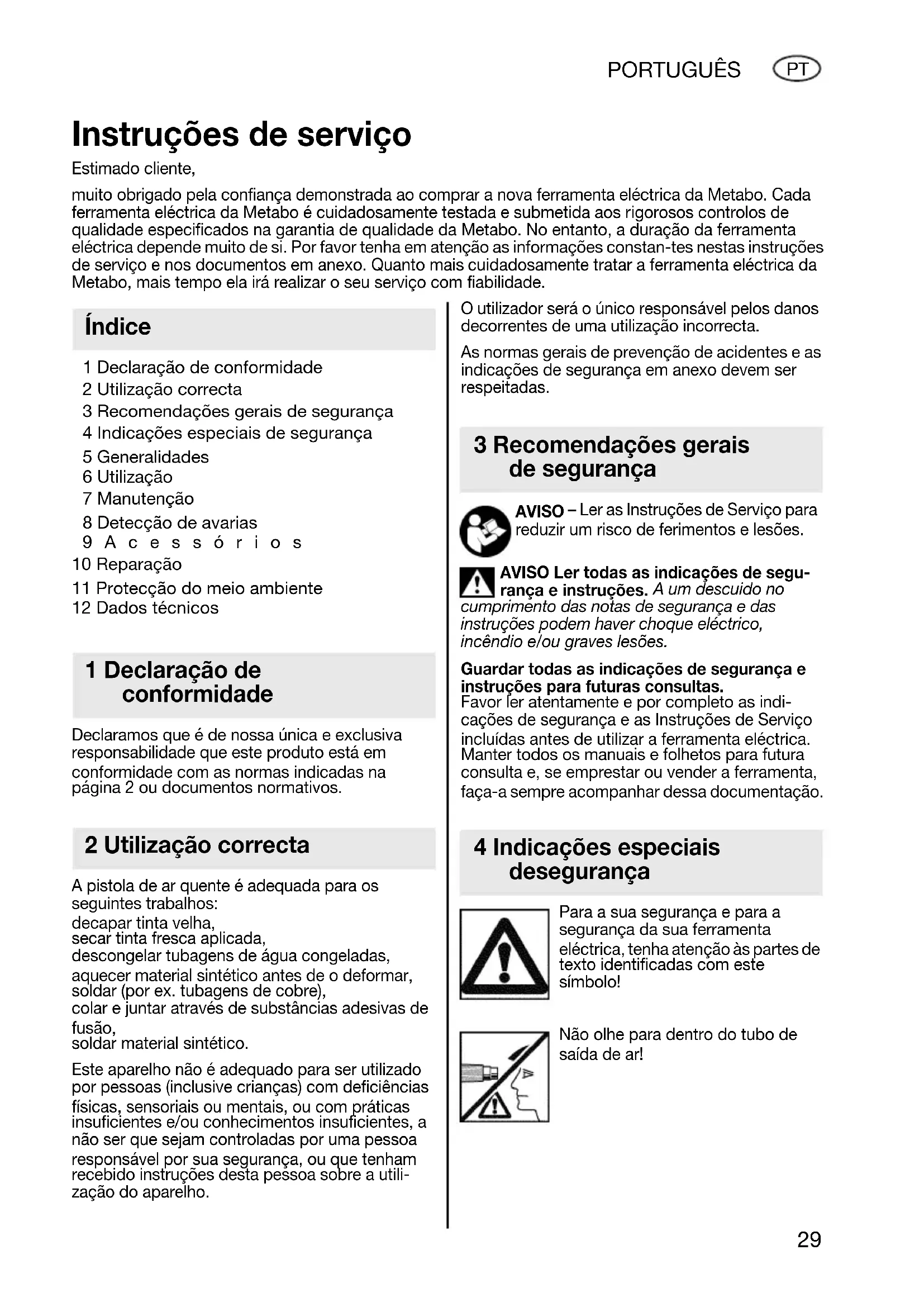 1 Declaração de conformidade 2 Utilização correcta 3 Recomendações gerais de segurança 4 Indicações especiais de segurança 5 Generalidades 6 Utilização 7 Manutenção 8 Detecção de avarias 9Acessórios 10 Reparação 11 Protecção do meio ambiente 12 Dados técnicos Declaramos que é de nossa única e exclusiva responsabilidade que este produto está em conformidade com as normas indicadas na página 2 ou documentos normativos. A pistola de ar quente é adequada para os seguintes trabalhos: decapar tinta velha, secar tinta fresca aplicada, descongelar tubagens de água congeladas, aquecer material sintético antes de o deformar, soldar (por ex. tubagens de cobre), colar e juntar através de substâncias adesivas de fusão, soldar material sintético. Este aparelho não é adequado para ser utilizado por pessoas (inclusive crianças) com deficiências físicas, sensoriais ou mentais, ou com práticas insuficientes e/ou conhecimentos insuficientes, a não ser que sejam controladas por uma pessoa responsável por sua segurança, ou que tenham recebido instruções desta pessoa sobre a utili- zação do aparelho. O utilizador será o único responsável pelos danos decorrentes de uma utilização incorrecta. As normas gerais de prevenção de acidentes e as indicações de segurança em anexo devem ser respeitadas. AVISO – Ler as Instruções de Serviço para reduzir um risco de ferimentos e lesões. AVISO Ler todas as indicações de segu- rança e instruções. A um descuido no cumprimento das notas de segurança e das instruções podem haver choque eléctrico, incêndio e/ou graves lesões. Guardar todas as indicações de segurança e instruções para futuras consultas. Favor ler atentamente e por completo as indi- cações de segurança e as Instruções de Serviço incluídas antes de utilizar a ferramenta eléctrica. Manter todos os manuais e folhetos para futura consulta e, se emprestar ou vender a ferramenta, faça-a sempre acompanhar dessa documentação. Para a sua segurança e para a segurança da sua ferramenta eléctrica, tenha atenção às partes de texto identificadas com este símbolo! Não olhe para dentro do tubo de saída de ar! Instruções de serviço Estimado cliente, muito obrigado pela confiança demonstrada ao comprar a nova ferramenta eléctrica da Metabo. Cada ferramenta eléctrica da Metabo é cuidadosamente testada e submetida aos rigorosos controlos de qualidade especificados na garantia de qualidade da Metabo. No entanto, a duração da ferramenta eléctrica depende muito de si. Por favor tenha em atenção as informações constan-tes nestas instruções de serviço e nos documentos em anexo. Quanto mais cuidadosamente tratar a ferramenta eléctrica da Metabo, mais tempo ela irá realizar o seu serviço com fiabilidade. Índice 1 Declaração de conformidade 2 Utilização correcta 3 Recomendações gerais de segurança 4 Indicações especiais desegurança 17024612_0409 HE 2300 HE 2000 H 1600.book Seite 29 Dienstag, 16. Juni 2009 11:40 1130 PORTUGUÊS