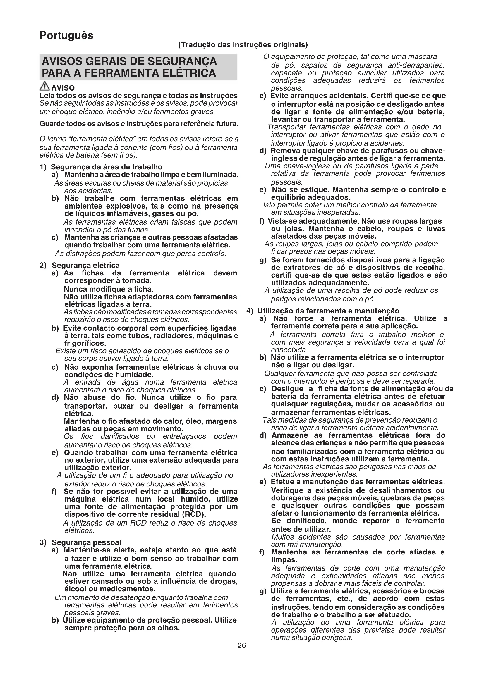 AVISO Leia todos os avisos de segurança e todas as instruções Se não seguir todas as instruções e os avisos, pode provocar um choque elétrico, incêndio e/ou ferimentos graves. Guarde todos os avisos e instruções para referência futura. O termo “ferramenta elétrica” em todos os avisos refere-se à sua ferramenta ligada à corrente (com fi os) ou à ferramenta elétrica de bateria (sem fi os).