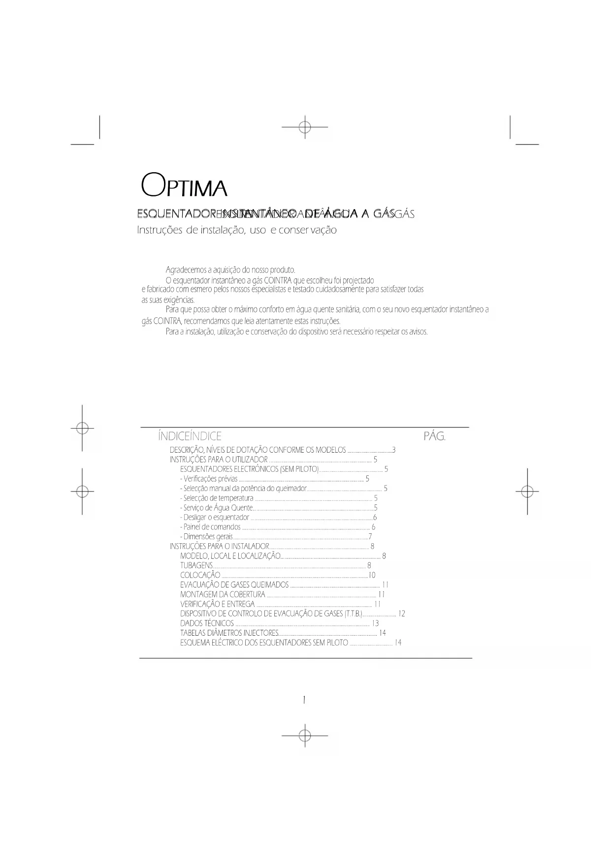 Agradecemos a aquisição do nosso produto. O esquentador instantâneo a gás COINTRA que escolheu foi projectado e fabricado com esmero pelos nossos especialistas e testado cuidadosamente para satisfazer todas as suas exigências. Para que possa obter o máximo conforto em água quente sanitária, com o seu novo esquentador instantâneo a gás COINTRA, recomendamos que leia atentamente estas instruções. Para a instalação, utilização e conservação do dispositivo será necessário respeitar os avisos.