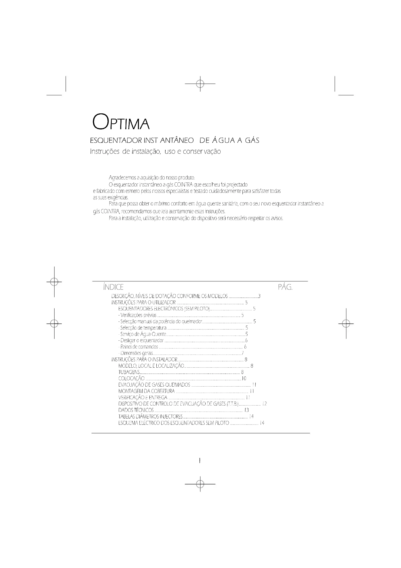 Agradecemos a aquisição do nosso produto. O esquentador instantâneo a gás COINTRA que escolheu foi projectado e fabricado com esmero pelos nossos especialistas e testado cuidadosamente para satisfazer todas as suas exigências. Para que possa obter o máximo conforto em água quente sanitária, com o seu novo esquentador instantâneo a gás COINTRA, recomendamos que leia atentamente estas instruções. Para a instalação, utilização e conservação do dispositivo será necessário respeitar os avisos.