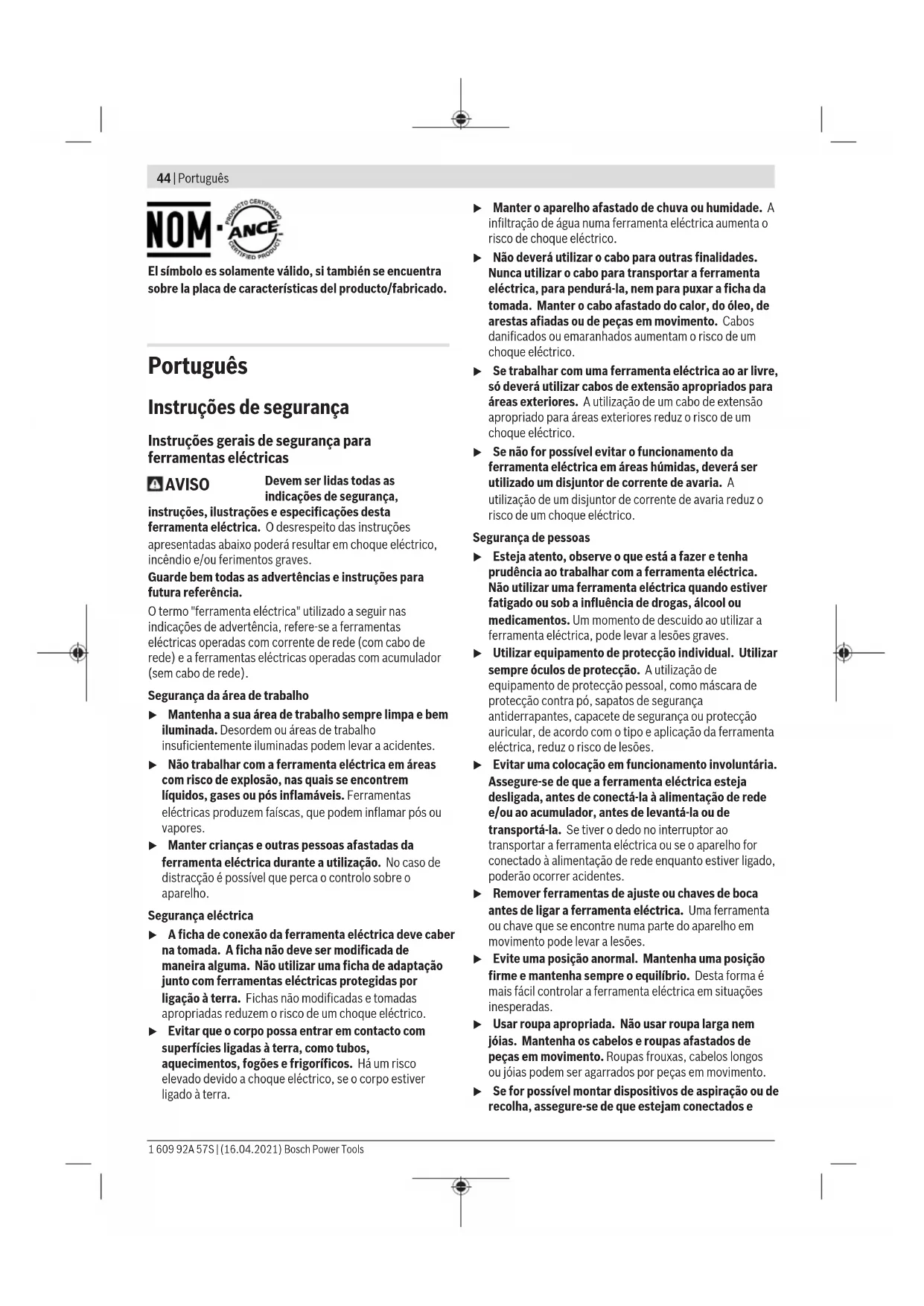 O nível de vibrações indicado nestas instruções e o valor de emissões sonoras foram medidos de acordo com um processo de medição normalizado e podem ser utilizados para a comparação de ferramentas elétricas. Também são adequados para uma avaliação provisória das emissões sonoras e de vibrações. O nível de vibrações indicado e o valor de emissões sonoras representam as aplicações principais da ferramenta elétrica. Se a ferramenta elétrica for utilizada para outras aplicações, com outras ferramentas de trabalho ou com manutenção insuficiente, é possível que o nível de vibrações e de emissões sonoras seja diferente. Isto pode aumentar sensivelmente a emissão sonora e de vibrações para o período completo de trabalho. Para uma estimação exata da emissão sonora e de vibrações, também deveriam ser considerados os períodos nos quais o aparelho está desligado ou funciona, mas não está sendo utilizado. Isto pode reduzir a emissão sonora e de vibrações durante o completo período de trabalho. Além disso também deverão ser estipuladas medidas de segurança para proteger o operador contra o efeito de vibrações, como por exemplo: manutenção de ferramentas elétricas e acessórios, manter as mãos quentes e organização dos processos de trabalho. Montagem u Antes de todos trabalhos na ferramenta elétrica deverá puxar a ficha de rede da tomada. Colocar o motor de fresagem na unidade de imersão/unidade copiadora (verfigurasA–B) Abra a alavanca tensora para a unidade de imersão/unidade copiadora(22). Empurre o motor de fresagem até ao batente para dentro da unidade de imersão/unidade copiadora. Na utilização da unidade copiadora(3) pressione a alavanca tensora(25) e empurre o motor de fresagem(1) na unidade copiadora(3), consoante a posição desejada, para cima ou para baixo, até que o mesmo, sem a alavanca tensora(25) pressionada, fique engatado num dos 3 entalhes(26). Feche a alavanca tensora para a unidade de imersão/ unidade copiadora(22). Ajuste a profundidade de fresagem desejada (ver "Ajustar a profundidade de fresagem", Página49). Separar o motor de fresagem da unidade de imersão/ unidade copiadora (verfiguraC) Abra a alavanca tensora para a unidade de imersão/unidade copiadora(22). Empurre o motor de fresagem até ao batente e mantenha-o nessa posição. Pressione a tecla de segurança(21) e retire por completo o motor de fresagem da unidade de imersão/unidade copiadora. Na utilização da unidade copiadora(3) prima adicionalmente a alavanca tensora(25). Bosch Power Tools 1 609 92A 57S | (16.04.2021)48 | Português Introduzir fresa (verfiguraD) u Para colocar e trocar as fresas, é recomendado utilizar luvas de proteção. Dependendo da aplicação, estão disponíveis ferramentas de fresagem de diversos modelos e qualidades. As fresas de aço de corte rápido de alto rendimento (HSS) são adequadas para o processamento de materiais macios, como p. ex., madeira macia e plástico. Fresas com gumes de metal duro (HM) são especialmente indicadas para materiais abrasivos e duros, como p. ex. madeira dura e alumínio. Ferramentas de fresagem originais do vasto programa de acessórios Bosch podem ser adquiridas através do seu revendedor especializado. Só utilizar ferramentas de fresagem limpas e em perfeitas condições. Se possível use fresas com um diâmetro da haste de12mm. Pode mudar a fresa se o motor de fresagem estiver inserido na unidade de imersão/unidade copiadora. Contudo recomendamos a troca de ferramenta com o motor de fresagem desmontado. – Retire o motor de fresagem da unidade de imersão/ unidade copiadora. – Prima e mantenha premida a tecla de bloqueio do veio(27)(➊). Se necessário, rode um pouco o veio à mão até o bloqueio engatar. Acione a tecla de bloqueio do veio(27) apenas com a ferramenta parada. – Solte a porca de capa(17) com a chave de bocas(28) (tamanho 24mm) rodando para a esquerda ➋. – Introduza a fresa na pinça de aperto. A haste da fresa deve ser introduzida, no mínimo20mm, na pinça de aperto. – Aperte a porca de capa(17) com a chave de bocas(28) (tamanho 24mm) rodando para a direita. Solte a tecla de bloqueio do veio(27). u Sem a manga de copiar montada, não insira fresas com um diâmetro superior a50mm. Estas fresas não passam através da placa de base. u Nunca apertar a pinça de aperto com a porca de capa, enquanto não estiver montada uma fresa. Caso contrário, pode danificar a pinça de aperto. Aspiração de pó/de aparas Pós de materiais como por exemplo, tintas que contém chumbo, alguns tipos de madeira, minerais e metais, podem ser nocivos à saúde. O contacto ou a inalação dos pós pode provocar reações alérgicas e/ou doenças nas vias respiratórias do utilizador ou das pessoas que se encontrem por perto. Certos pós, como por exemplo pó de carvalho e faia são considerados como sendo cancerígenos, especialmente quando juntos com substâncias para o tratamento de madeiras (cromato, produtos de proteção da madeira). Material que contém asbesto só deve ser processado por pessoal especializado. – Se possível deverá usar um dispositivo de aspiração de pó apropriado para o material. – Assegurar uma boa ventilação do local de trabalho. – É recomendável usar uma máscara de proteção respiratória com filtro da classe P2. Observe as diretivas para os materiais a serem processados, vigentes no seu país. u Evite a acumulação de pó no local de trabalho. Pós podem entrar levemente em ignição. Montar o adaptador de aspiração na unidade de imersão (verfiguraE) O adaptador de aspiração(30) pode ser montado com a união de mangueira para a frente ou para trás. Com o adaptador da manga de copiar(50) inserido tem de montar, se necessário, o adaptador da manga de copiar rodado em 180°, para que o adaptador de aspiração(30) não toque na alavanca de desbloqueio(52). Fixe o adaptador de aspiração(30) com os 2 parafusos serril