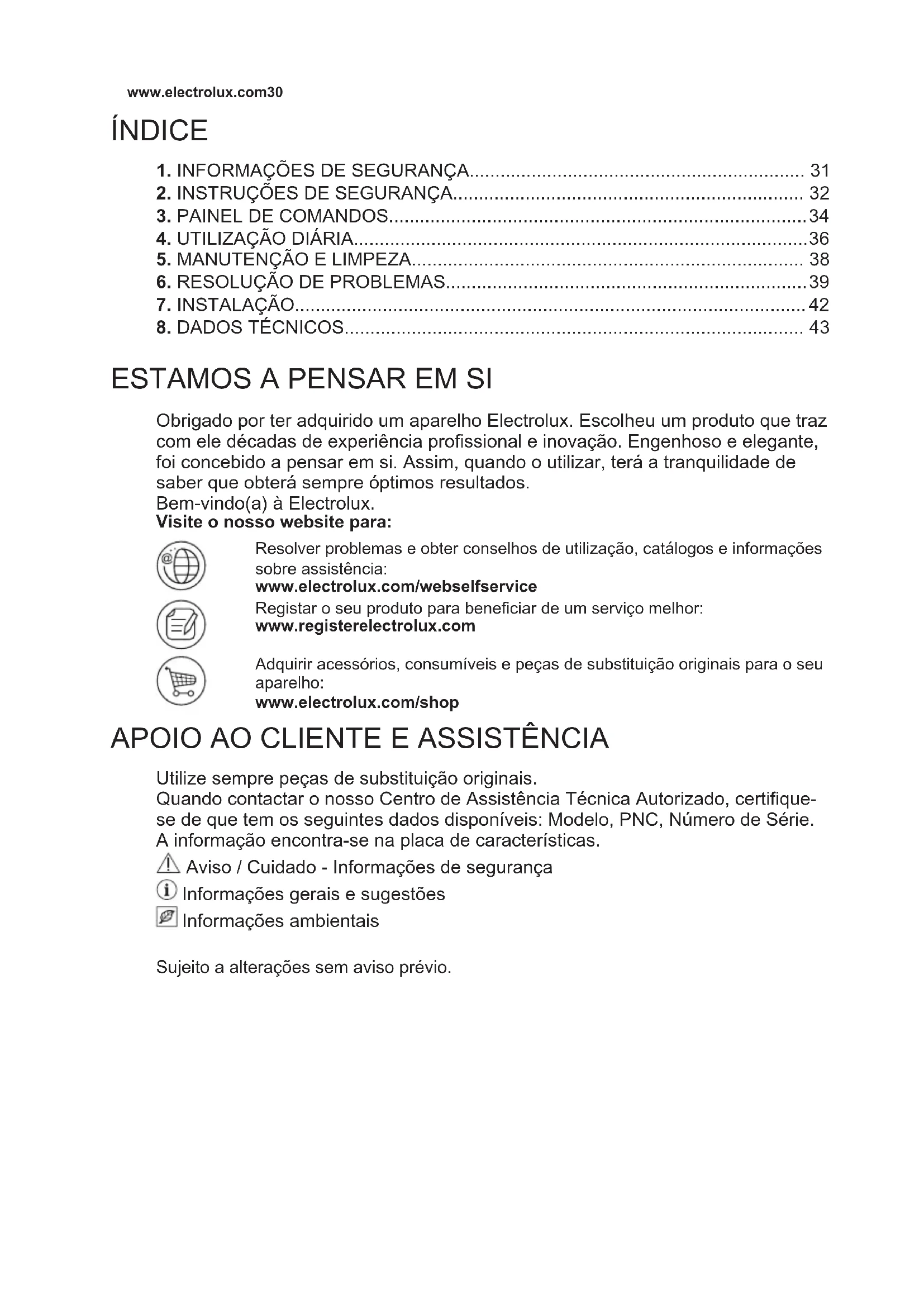 Obrigado por ter adquirido um aparelho Electrolux. Escolheu um produto que traz com ele décadas de experiência profissional e inovação. Engenhoso e elegante, foi concebido a pensar em si. Assim, quando o utilizar, terá a tranquilidade de saber que obterá sempre óptimos resultados. Bem-vindo(a) à Electrolux. Visite o nosso website para: Resolver problemas e obter conselhos de utilização, catálogos e informações sobre assistência: www.electrolux.com/webselfservice Registar o seu produto para beneficiar de um serviço melhor: www.registerelectrolux.com Adquirir acessórios, consumíveis e peças de substituição originais para o seu aparelho: www.electrolux.com/shop