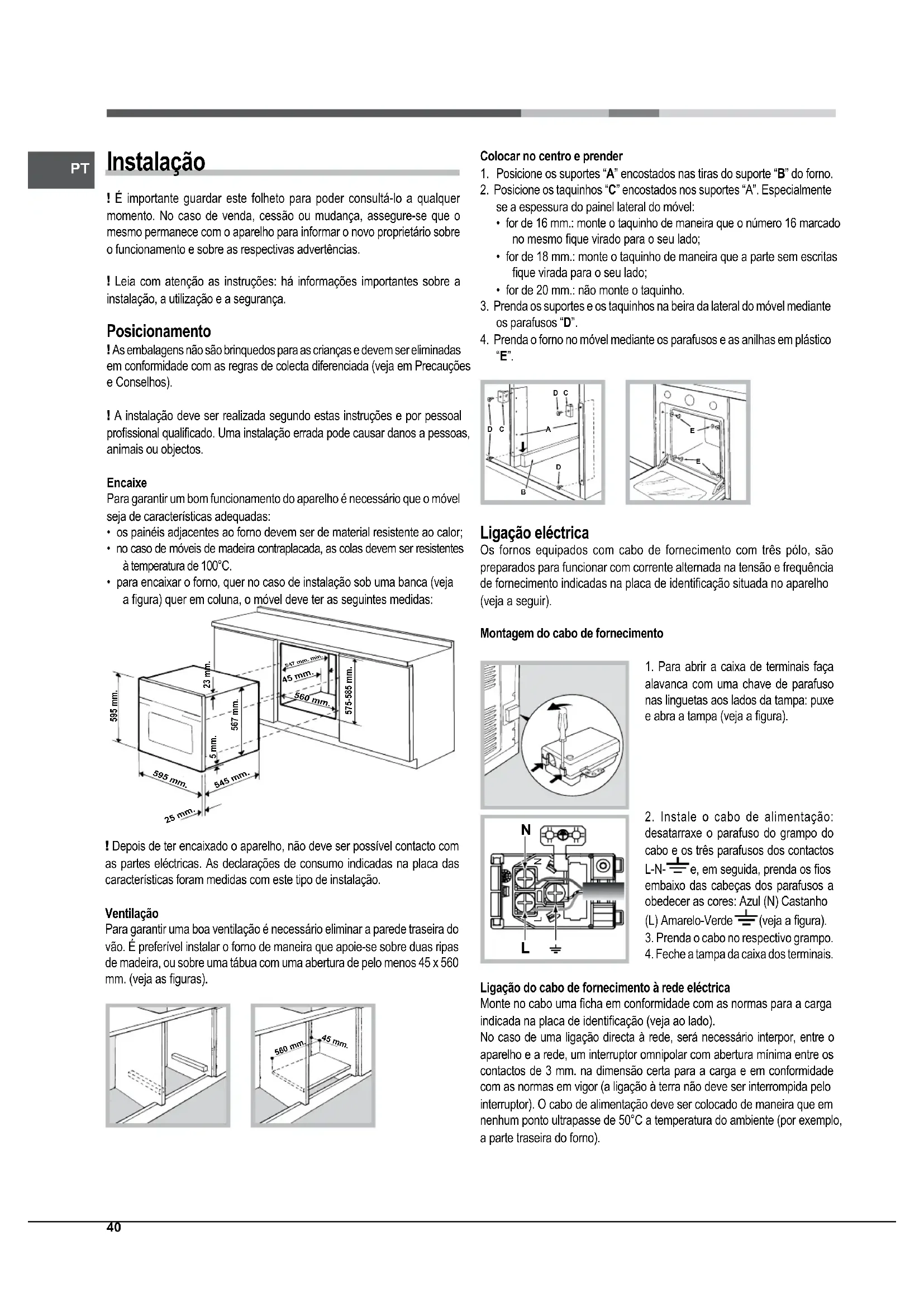 Instalação ! É importante guardar este folheto para poder consultá-lo a qualquer momento. No caso de venda, cessão ou mudança, assegure-se que o mesmo permanece com o aparelho para informar o novo proprietário sobre o funcionamento e sobre as respectivas advertências.! Leia com atenção as instruções: há informações importantes sobre a instalação, a utilização e a segurança. Posicionamento ! As embalagens não são brinquedos para as crianças e devem ser eliminadas em conformidade com as regras de colecta diferenciada (veja em Precauções e Conselhos).! A instalação deve ser realizada segundo estas instruções e por pessoal prossional qualicado. Uma instalação errada pode causar danos a pessoas, animais ou objectos.EncaixePara garantir um bom funcionamento do aparelho é necessário que o móvel seja de características adequadas:• os painéis adjacentes ao forno devem ser de material resistente ao calor;• no caso de móveis de madeira contraplacada, as colas devem ser resistentes à temperatura de 100°C.• para encaixar o forno, quer no caso de instalação sob uma banca (veja a gura) quer em coluna, o móvel deve ter as seguintes medidas: 595 mm.595 mm.25 mm.545 mm.5 mm.567 mm.23 mm.575-585 mm.45 mm.560 mm. 547 mm. min. ! Depois de ter encaixado o aparelho, não deve ser possível contacto com as partes eléctricas. As declarações de consumo indicadas na placa das características foram medidas com este tipo de instalação.VentilaçãoPara garantir uma boa ventilação é necessário eliminar a parede traseira do vão. É preferível instalar o forno de maneira que apoie-se sobre duas ripas de madeira, ou sobre uma tábua com uma abertura de pelo menos 45 x 560 mm. (veja as guras). 560 mm. 45 mm. Colocar no centro e prender