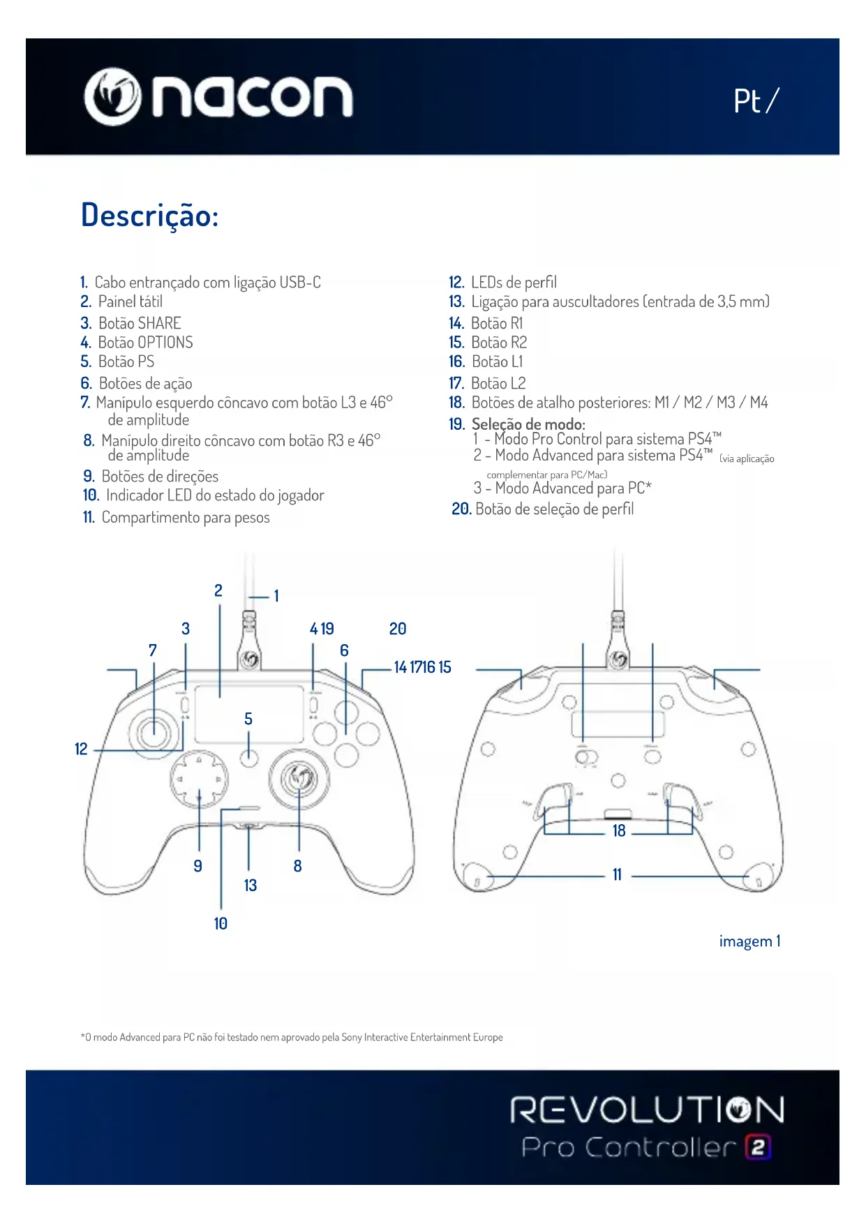 Gestão dos pesos: imagem 2Pt / REVOLUTION Pro Controller 2 Obrigado por comprares este produto NACON. Em caso de avaria, consulta a informação do apoio ao cliente no final deste manual. Agradecemos todo o feedback que nos possa ajudar a melhorar os nossos produtos. Guarda este manual de instruções para referência futura. Garantia Este produto com a marca comercial NACON tem garantia do fabricante “Bigben Interactive” durante um período de 2 anos a partir da data de compra e será, durante este período, substituído por um modelo igual ou semelhante, à nossa escolha, e sem custos caso exista um defeito devido a material ou fabrico defeituoso. Esta garantia não cobre defeitos que surjam de danos acidentais, uso indevido ou desgaste e está disponível apenas para o adquirente original do produto. Isto não afeta os teus direitos previstos pela lei. Para mais informações sobre garantia e apoio ao cliente, envia um email para support@nacongaming.com ou visita www.nacongaming.com Conteúdos da embalagem 1 x REVOLUTION Pro Controller 2 1 x cabo de ligação de 3 m 1 x manual de instruções 2 x pesos de 10 g 2 x pesos de 14 g 2 x pesos de 17 g 1 x chave para o compartimento dos pesos 1 x bolsa Funcionalidades Este comando tem 3 modos: Modo 1 = modo Pro Control para sistema PS4™ (ver secção 2) Modo 2 = modo Advanced para sistema PS4™ (ver secção 3) Modo 3 = modo Advanced para PC (ver secção 4)Pt / imagem 3 1/ Modo 1: modo Pro Control para sistema PS4™ Nota: não toques nos manípulos ou nos gatilhos quando ligares o comando a um sistema PS4™.