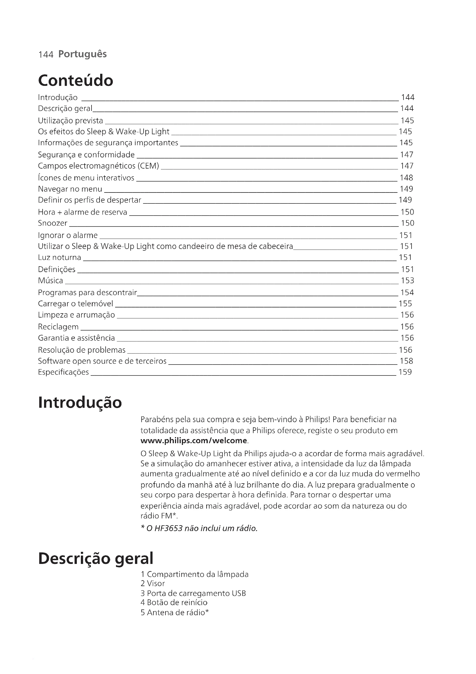 - O HF3653 não inclui um rádio. Utilização prevista O Sleep & Wake-Up Light da Philips destina-se a proporcionar um despertar mais natural e revigorado, e uma sensação de relaxamento antes de adormecer. Este não é um produto para iluminação geral. Os efeitos do Sleep & Wake-Up Light O Sleep & Wake-Up Light da Philips prepara gradualmente o seu corpo para o despertar durante os últimos 30 minutos de sono. Ao início da manhã, os nossos olhos estão mais sensíveis à luz do que quando estamos acordados. Durante esse período, a luz de baixa intensidade de um amanhecer simulado prepara o nosso corpo para despertar e para ficar alerta. Os utilizadores do Sleep & Wake-Up Light acordam com mais facilidade, estão geralmente mais bem dispostos durante a manhã e sentem-se mais enérgicos. Como a sensibilidade à luz varia de pessoa para pessoa, pode definir a intensidade da luz do Sleep & Wake-Up Light para um nível adequado à sua sensibilidade para começar o dia da melhor forma. Para desfrutar plenamente dos efeitos do Sleep & Wake-Up Light, coloque o aparelho a cerca de 40cm –50cm da sua cabeça, numa superfície estável e plana da mesinha de cabeceira. Para saber mais sobre o Sleep & Wake-Up Light, visite www.philips.com. Informações de segurança importantes Leia cuidadosamente estas informações importantes antes de utilizar o aparelho e guarde-o para uma eventual consulta futura. Perigo