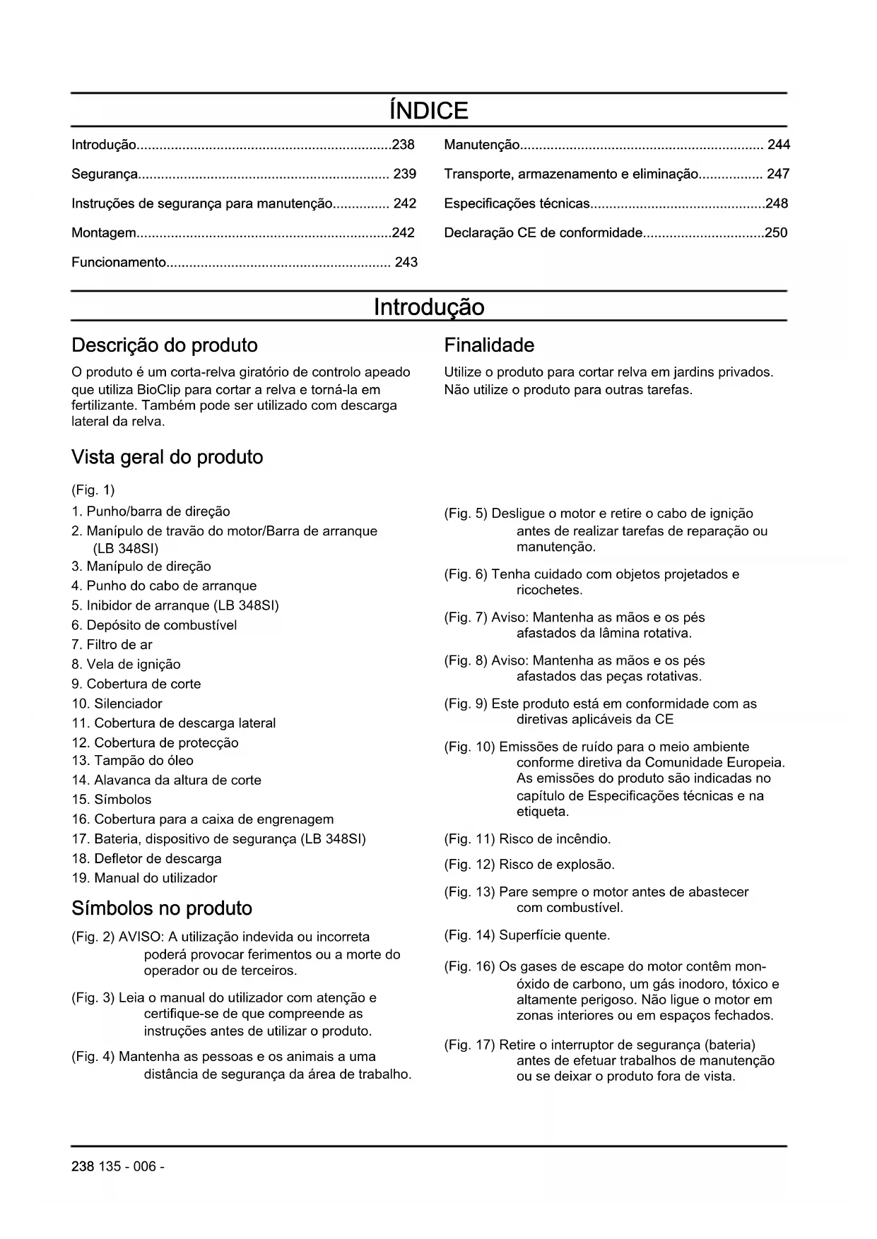 Símbolos no produto (Fig. 2) AVISO: A utilização indevida ou incorreta poderá provocar ferimentos ou a morte do operador ou de terceiros. (Fig. 3) Leia o manual do utilizador com atenção e certifique-se de que compreende as instruções antes de utilizar o produto. (Fig. 4) Mantenha as pessoas e os animais a uma distância de segurança da área de trabalho. (Fig. 5) Desligue o motor e retire o cabo de ignição antes de realizar tarefas de reparação ou manutenção. (Fig. 6) Tenha cuidado com objetos projetados e ricochetes. (Fig. 7) Aviso: Mantenha as mãos e os pés afastados da lâmina rotativa. (Fig. 8) Aviso: Mantenha as mãos e os pés afastados das peças rotativas. (Fig. 9) Este produto está em conformidade com as diretivas aplicáveis da CE (Fig. 10) Emissões de ruído para o meio ambiente conforme diretiva da Comunidade Europeia. As emissões do produto são indicadas no capítulo de Especificações técnicas e na etiqueta. (Fig. 11) Risco de incêndio. (Fig. 12) Risco de explosão. (Fig. 13) Pare sempre o motor antes de abastecer com combustível. (Fig. 14) Superfície quente. (Fig. 16) Os gases de escape do motor contêm mon- óxido de carbono, um gás inodoro, tóxico e altamente perigoso. Não ligue o motor em zonas interiores ou em espaços fechados. (Fig. 17) Retire o interruptor de segurança (bateria) antes de efetuar trabalhos de manutenção ou se deixar o produto fora de vista. 238 135 - 006 -(Fig. 18) Procedimento de arranque para LB 248S, LB 253S: Empurre o manípulo de travão do motor para baixo e puxe o punho do cabo de arranque. (Fig. 19) Procedimento de arranque para LB 348SI: Solte o inibidor de arranque e empurre a barra de arranque para baixo. (Fig. 15) Código para leitura. Nota: Os restantes símbolos/autocolantes existentes no produto dizem respeito a requisitos para homologação em algumas áreas comerciais. Responsabilidade pelo produto Como referido nas leis de responsabilidade pelo produto, não somos responsáveis por danos causados pelo nosso produto se:
