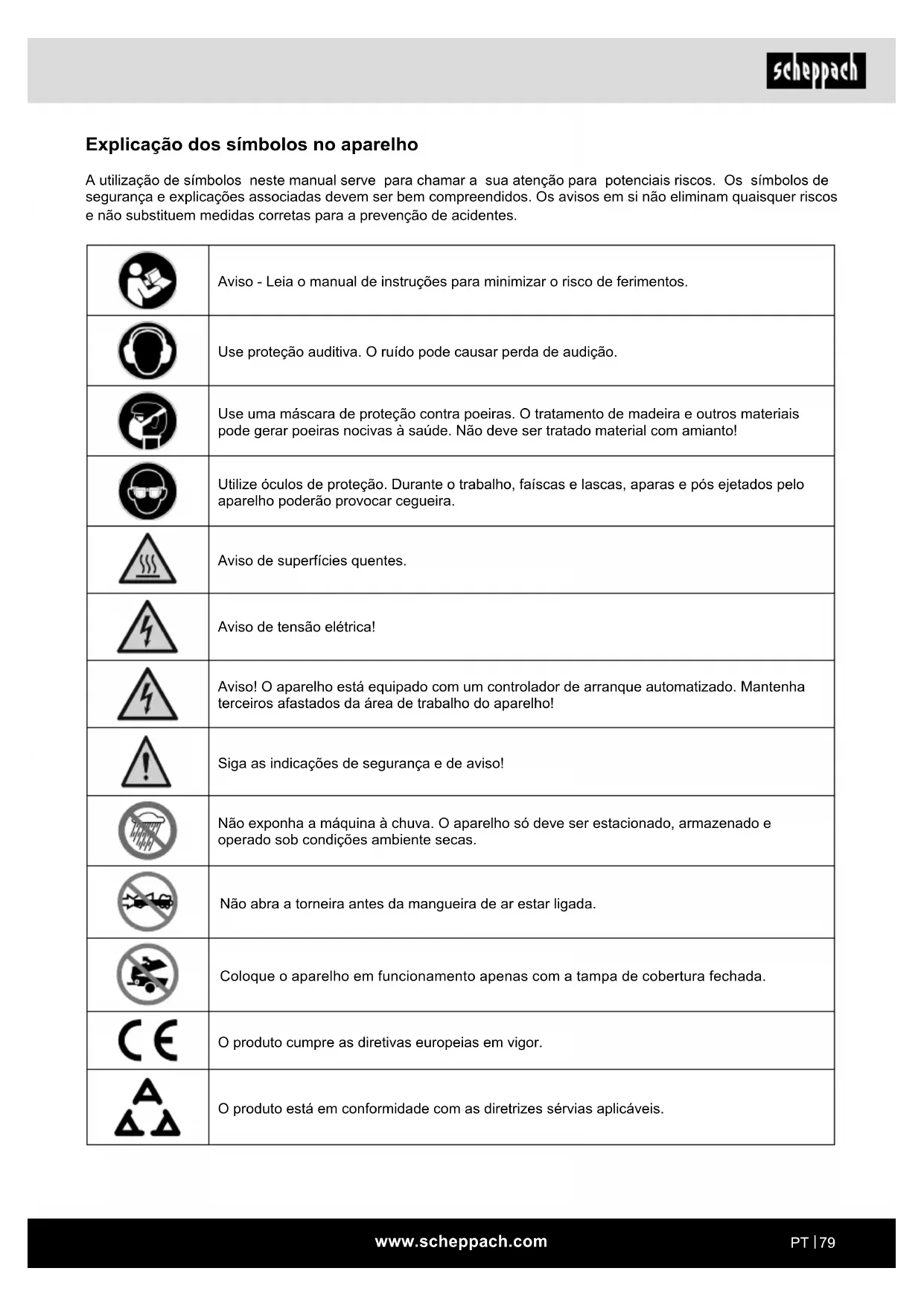 Explicação dos símbolos no aparelho A utilização de símbolos neste manual serve para chamar a sua atenção para potenciais riscos. Os símbolos de segurança e explicações associadas devem ser bem compreendidos. Os avisos em si não eliminam quaisquer riscos e não substituem medidas corretas para a prevenção de acidentes. Aviso - Leia o manual de instruções para minimizar o risco de ferimentos. Use proteção auditiva. O ruído pode causar perda de audição. Use uma máscara de proteção contra poeiras. O tratamento de madeira e outros materiais pode gerar poeiras nocivas à saúde. Não deve ser tratado material com amianto! Utilize óculos de proteção. Durante o trabalho, faíscas e lascas, aparas e pós ejetados pelo aparelho poderão provocar cegueira. Aviso de superfícies quentes. Aviso de tensão elétrica! Aviso! O aparelho está equipado com um controlador de arranque automatizado. Mantenha terceiros afastados da área de trabalho do aparelho! Siga as indicações de segurança e de aviso! Não exponha a máquina à chuva. O aparelho só deve ser estacionado, armazenado e operado sob condições ambiente secas. Não abra a torneira antes da mangueira de ar estar ligada. Coloque o aparelho em funcionamento apenas com a tampa de cobertura fechada. O produto cumpre as diretivas europeias em vigor. O produto está em conformidade com as diretrizes sérvias aplicáveis.www.scheppach.com