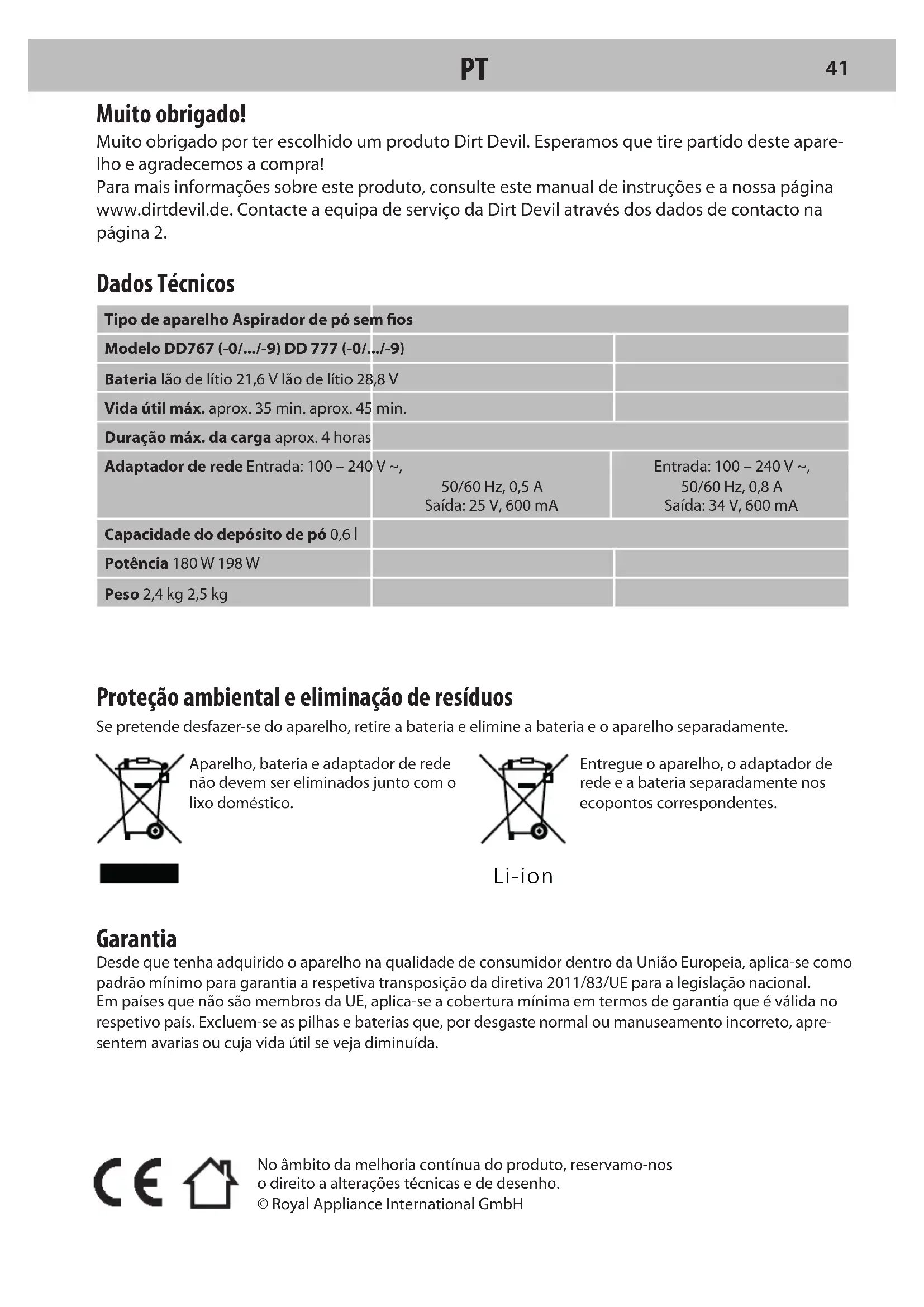 ITNo âmbito da melhoria contínua do produto, reservamo-nos o direito a alterações técnicas e de desenho.© Royal Appliance International GmbH Muito obrigado! Muito obrigado por ter escolhido um produto Dirt Devil. Esperamos que tire partido deste apare- lho e agradecemos a compra! Para mais informações sobre este produto, consulte este manual de instruções e a nossa página www.dirtdevil.de. Contacte a equipa de serviço da Dirt Devil através dos dados de contacto na página 2. Dados Técnicos Tipo de aparelho Aspirador de pó sem osModelo DD767 (-0/.../-9) DD 777 (-0/.../-9)Bateria Ião de lítio 21,6 V Ião de lítio 28,8 VVida útil máx. aprox. 35 min. aprox. 45 min.Duração máx. da carga aprox. 4 horasAdaptador de rede Entrada: 100 – 240 V ~, 50/60 Hz, 0,5 A Saída: 25 V, 600 mAEntrada: 100 – 240 V ~, 50/60 Hz, 0,8 A Saída: 34 V, 600 mACapacidade do depósito de pó 0,6 lPotência 180 W 198 WPeso 2,4 kg 2,5 kg Proteção ambiental e eliminação de resíduos Se pretende desfazer-se do aparelho, retire a bateria e elimine a bateria e o aparelho separadamente.Aparelho, bateria e adaptador de rede não devem ser eliminados junto com o lixo doméstico.Entregue o aparelho, o adaptador de rede e a bateria separadamente nos ecopontos correspondentes. Garantia Desde que tenha adquirido o aparelho na qualidade de consumidor dentro da União Europeia, aplica-se como padrão mínimo para garantia a respetiva transposição da diretiva 2011/83/UE para a legislação nacional. Empaíses que não são membros da UE, aplica-se a cobertura mínima em termos de garantia que é válida no respetivo país. Excluem-se as pilhas e baterias que, por desgaste normal ou manuseamento incorreto, apre-sentem avarias ou cuja vida útil se veja diminuída. Li-ion
