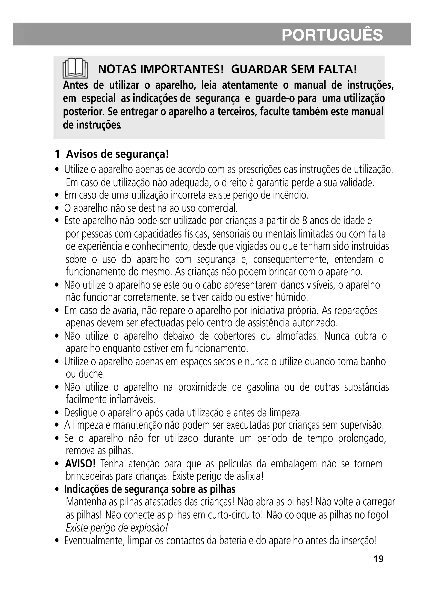 Mantenha as pilhas afastadas das crianças! Não abra as pilhas! Não volte a carregar as pilhas! Não conecte as pilhas em curto-circuito! Não coloque as pilhas no fogo! Existe perigo de explosão!