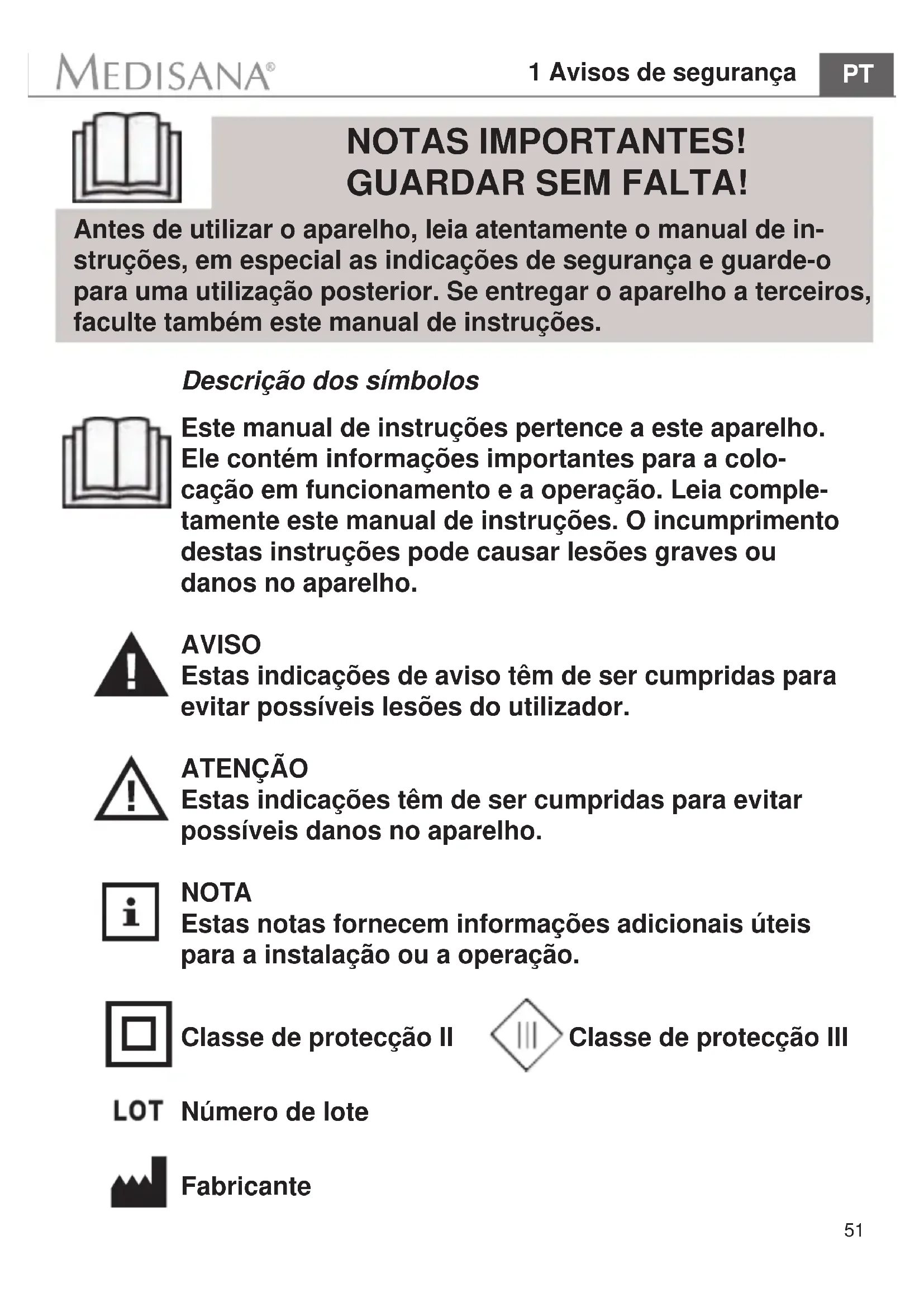 Descrição dos símbolos Este manual de instruções pertence a este aparelho. Ele contém informações importantes para a colo- cação em funcionamento e a operação. Leia comple- tamente este manual de instruções. O incumprimento destas instruções pode causar lesões graves ou danos no aparelho. AVISO Estas indicações de aviso têm de ser cumpridas para evitar possíveis lesões do utilizador. ATENÇÃO Estas indicações têm de ser cumpridas para evitar possíveis danos no aparelho. NOTA Estas notas fornecem informações adicionais úteis para a instalação ou a operação. Classe de protecção II Classe de protecção III Número de lote Fabricante Antes de utilizar o aparelho, leia atentamente o manual de in- struções, em especial as indicações de segurança e guarde-o para uma utilização posterior. Se entregar o aparelho a terceiros, faculte também este manual de instruções. NOTAS IMPORTANTES!