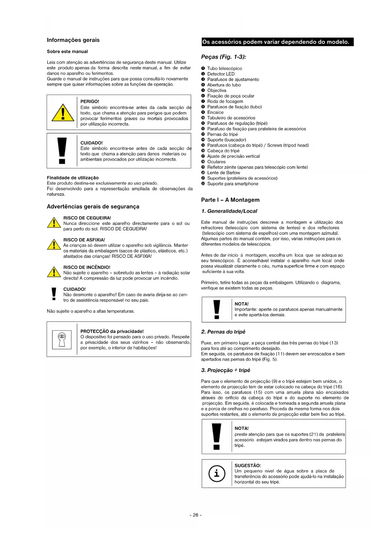 Este manual de instruções descreve a montagem e utilização dos refractores (telescópio com sistema de lentes) e dos reflectores (telescópio com sistema de espelhos) com uma montagem azimutal. Algumas partes do manual contêm, por isso, várias instruções para os diferentes modelos de telescópios. Antes de dar inicio à montagem, escolha um loca que se adequa ao seu telescópico. È aconselhável instalar o aparelho num local onde possa visualizalr claramente o céu, numa superficie firme e com espaço suficiente à sua volta. Primeiro, tetire todas as peças da embalagem. Utilizando o diagrama, verifique se existem todas as peças. NOTA! Importante: aperte os parafusos apenas manualmente e evite apertá-los demais.