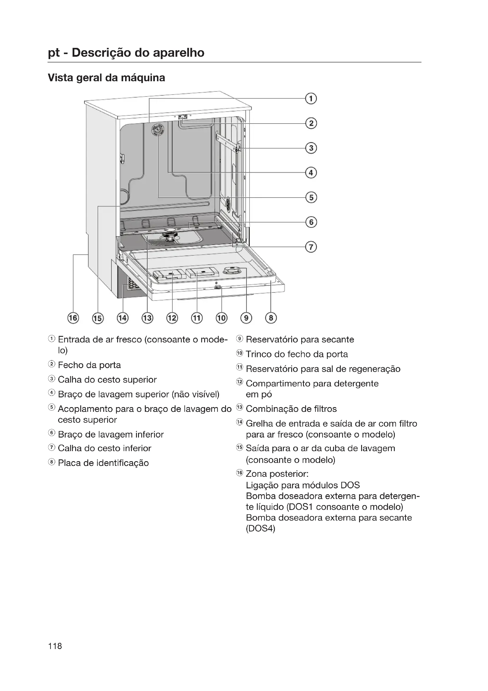 Zona posterior: Ligação para módulos DOS Bomba doseadora externa para detergen- te líquido (DOS1 consoante o modelo) Bomba doseadora externa para secante (DOS4)pt - Descrição do aparelho