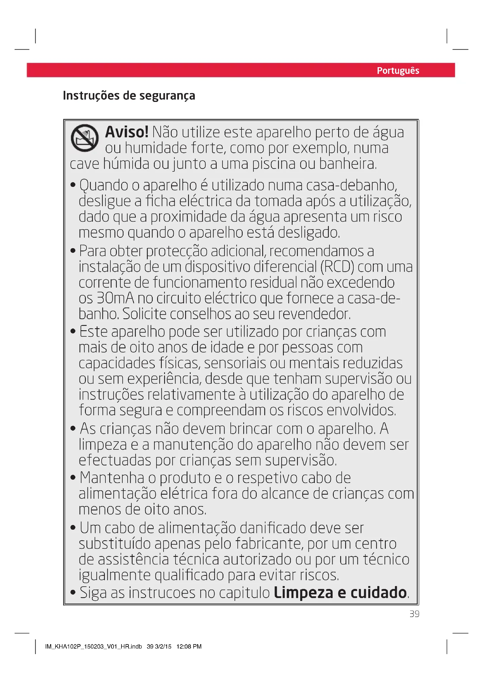- Este aparecido pode ser utilisé por crianças com mais de oito anos de idade e por pessoas com capacidades físicas, sensoriais ou mentalais reduzidas ou sem experiência, desde que tenham supervisão ou instruções relativamente à'utilisation do aparecido de forma segura e comprehendam os riscos envolvidos.