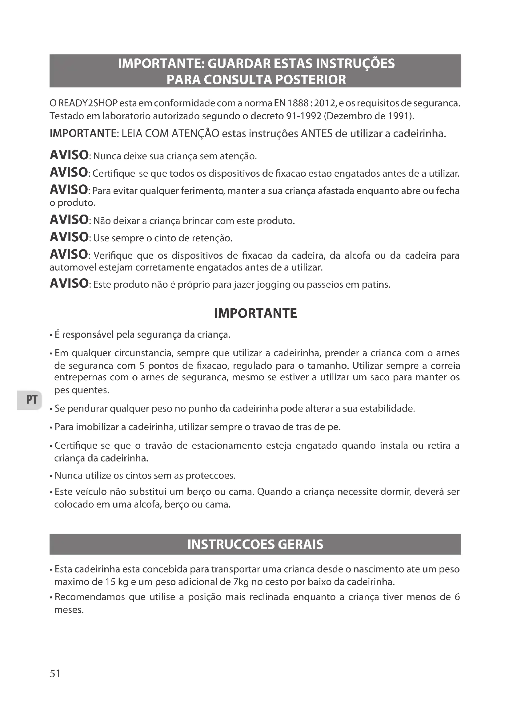 - Ultrapasse os obstáculos (pavimentos, etc…) com cuidado. A utilização frequente em mau piso pode danicar o seu carro de passeio. O READY2SHOP esta em conformidade com a norma EN 1888 : 2012, e os requisitos de seguranca. Testado em laboratorio autorizado segundo o decreto 91-1992 (Dezembro de 1991). IMPORTANTE: LEIA COM ATENÇÃO estas instruções ANTES de utilizar a cadeirinha. AVISO: Nunca deixe sua criança sem atenção. AVISO: Certique-se que todos os dispositivos de xacao estao engatados antes de a utilizar. AVISO: Para evitar qualquer ferimento, manter a sua criança afastada enquanto abre ou fecha o produto. AVISO: Não deixar a criança brincar com este produto. AVISO: Use sempre o cinto de retenção. AVISO: Verique que os dispositivos de xacao da cadeira, da alcofa ou da cadeira para automovel estejam corretamente engatados antes de a utilizar. AVISO: Este produto não é próprio para jazer jogging ou passeios em patins. IMPORTANTE