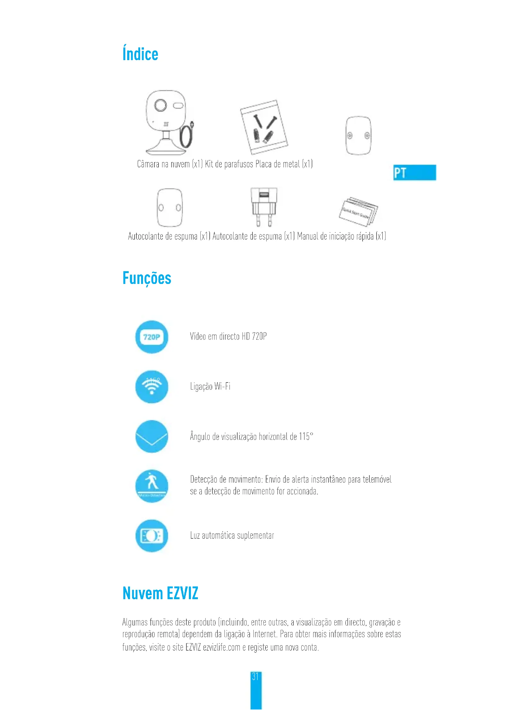 È preferibile utilizzare l'alimentatore standard EZVIZ per assicurare una tensione di alimentazione stabile.31 Índice Câmara na nuvem (x1) Kit de parafusos Placa de metal (x1) Autocolante de espuma (x1) Autocolante de espuma (x1) Manual de iniciação rápida (x1) Funções Vídeo em directo HD 720P Ligação Wi-Fi Ângulo de visualização horizontal de 115° Detecção de movimento: Envio de alerta instantâneo para telemóvel se a detecção de movimento for accionada. Luz automática suplementar Nuvem EZVIZ Algumas funções deste produto (incluindo, entre outras, a visualização em directo, gravação e reprodução remota) dependem da ligação à Internet. Para obter mais informações sobre estas funções, visite o site EZVIZ ezvizlife.com e registe uma nova conta. 115°32 Introdução Nome Descrição Luz de i nfravermelhos Fonte de luz automática para visão nocturna. O modo de vídeo tem duas funções: cor (para gravação à luz do dia) e preto e branco com iluminador de infravermelhos (para gravações nocturnas). Indicador LED