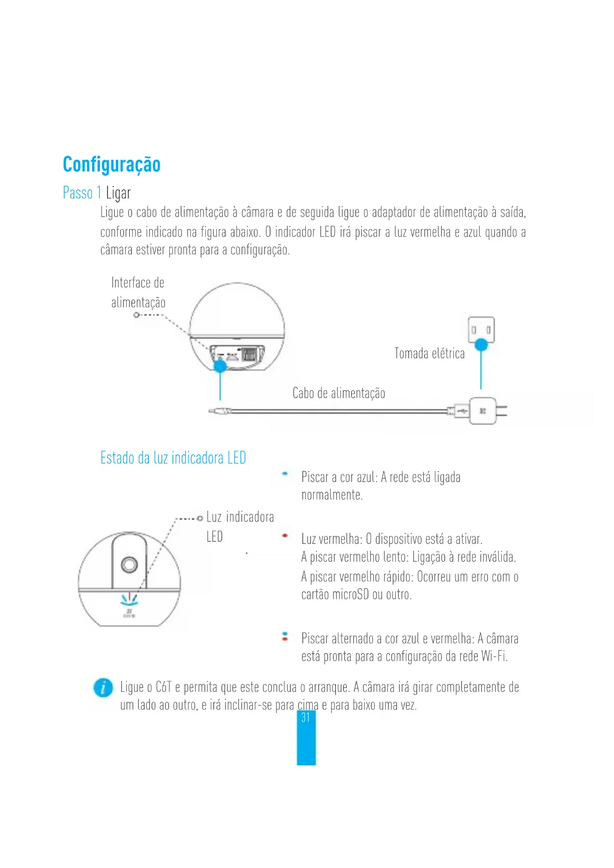 precedentemente connessa alla rete Wi-Fi, si connetterà automaticamente alla stessa rete Wi-Fi.30 Appendice Contenuto della confezione C6T (x1) Base (x1) Cavo di alimentazione (x1) Dima dei fori d'installazione (x1) Kit di tasselli (x1) Alimentatore (x1) Guida introduttiva (x1)31 Configuração Passo 1 Ligar Ligue o cabo de alimentação à câmara e de seguida ligue o adaptador de alimentação à saída, conforme indicado na figura abaixo. O indicador LED irá piscar a luz vermelha e azul quando a câmara estiver pronta para a configuração. Tomada elétrica Interface de alimentação Cabo de alimentação Estado da luz indicadora LED Piscar a cor azul: A rede está ligada normalmente. Luz vermelha: O dispositivo está a ativar. A piscar vermelho lento: Ligação à rede inválida. A piscar vermelho rápido: Ocorreu um erro com o cartão microSD ou outro. Piscar alternado a cor azul e vermelha: A câmara está pronta para a configuração da rede Wi-Fi. Luz indicadora LED Ligue o C6T e permita que este conclua o arranque. A câmara irá girar completamente de um lado ao outro, e irá inclinar-se para cima e para baixo uma vez.32 Passo 2 Configuração da câmara
