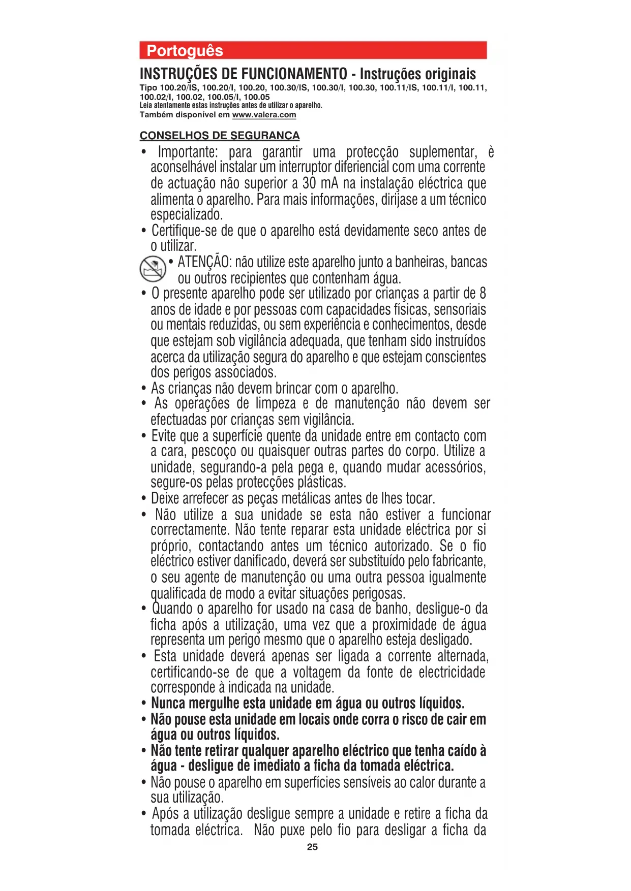 DE SEGURANÇA e FUNÇÃO “HOT” O aparelho desliga-se automaticamente após 60 minutos do acendimento: - para os modelos 100.20/IS, 100.20/I, 100.20, 100.30/IS, 100.30/I, 100.30, 100.11/IS, 100.11/I, 100.11, 5 minutos antes da desactivação automática no visor (fig. 1, ref. 7) aparecem alternadamente a temperatura e a escrita “off”. No final dos 60 minutos se não for novamente activado o botão de acendimento (fig. 1, ref. 3), as placas alisadoras (fig. 1, ref. 2) começam a arrefecer; no visor aparece a escrita “Hot” que fica visível até o alcançar da temperatura, para evitar queimaduras ao tocar nas placas metálicas. - para os modelos 100.02/I, 100.02, 100.05/I e 100.05, 5 minutos antes da desactivação automática, o indicador luminoso (fig. 1, ref. 6) pisca muito lentamente. Com o passar dos 60 minutos, se não for novamente activado o botão de acendimento (fig. 1, ref. 3), as placas alisadoras (fig. 1, ref. 2) começam a arrefecer e o indicador luminoso pisca rapidamente 00060754 int_gen2018_Layout 1 22/01/2018 12:50 Pagina 2627 VALERA é marca registrada da Ligo Electric S.A. - Suíça O símbolo no produto ou na embalagem indica que este produto não pode ser tratado como lixo doméstico. Em vez disso deve ser entregue ao centro de recolha selectiva para a reciclagem de equipamento eléctrico e electrónico. Ao garantir uma eliminação adequada deste produto, irá ajudar a evitar eventuais consequências negativas para o meio ambiente e para a saúde pública, que, de outra forma, poderiam ser provocadas por um tratamento incorrecto do produto. Para obter informações mais pormenorizadas sobre a reciclagem deste produto, contacte os serviços municipalizados locais, o centro de recolha selectiva da sua área de residência ou o estabelecimento onde adquiriu o produto. até as placas não alcançarem uma temperatura que evita queimaduras ao entrar em contacto com as placas metálicas.