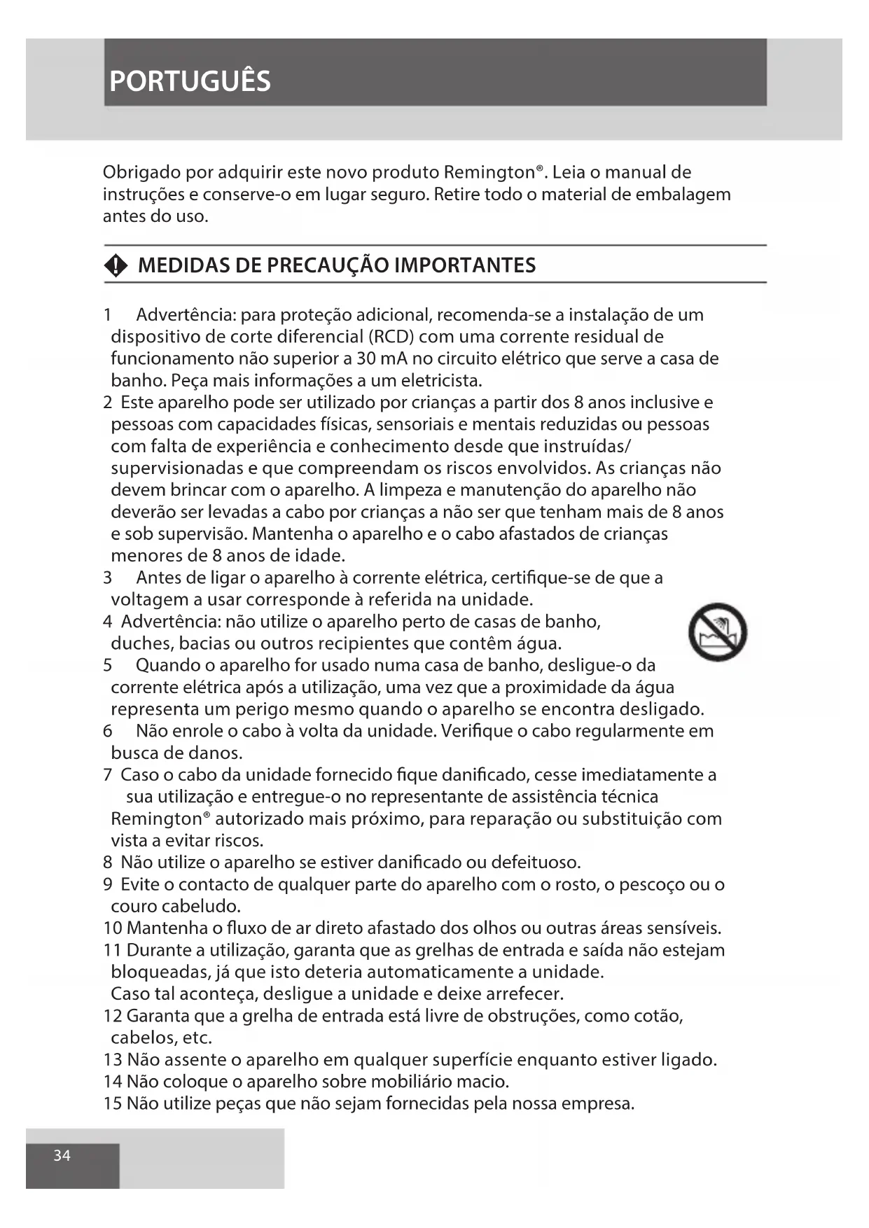 7 Caso o cabo da unidade fornecido fique danificado, cesse imeditamente a sua utilização e entrega-o no representante de assistência Tecnica Remington® autorizzato mais proxies, para reparação ou substituição com vista a evacatar riscos.