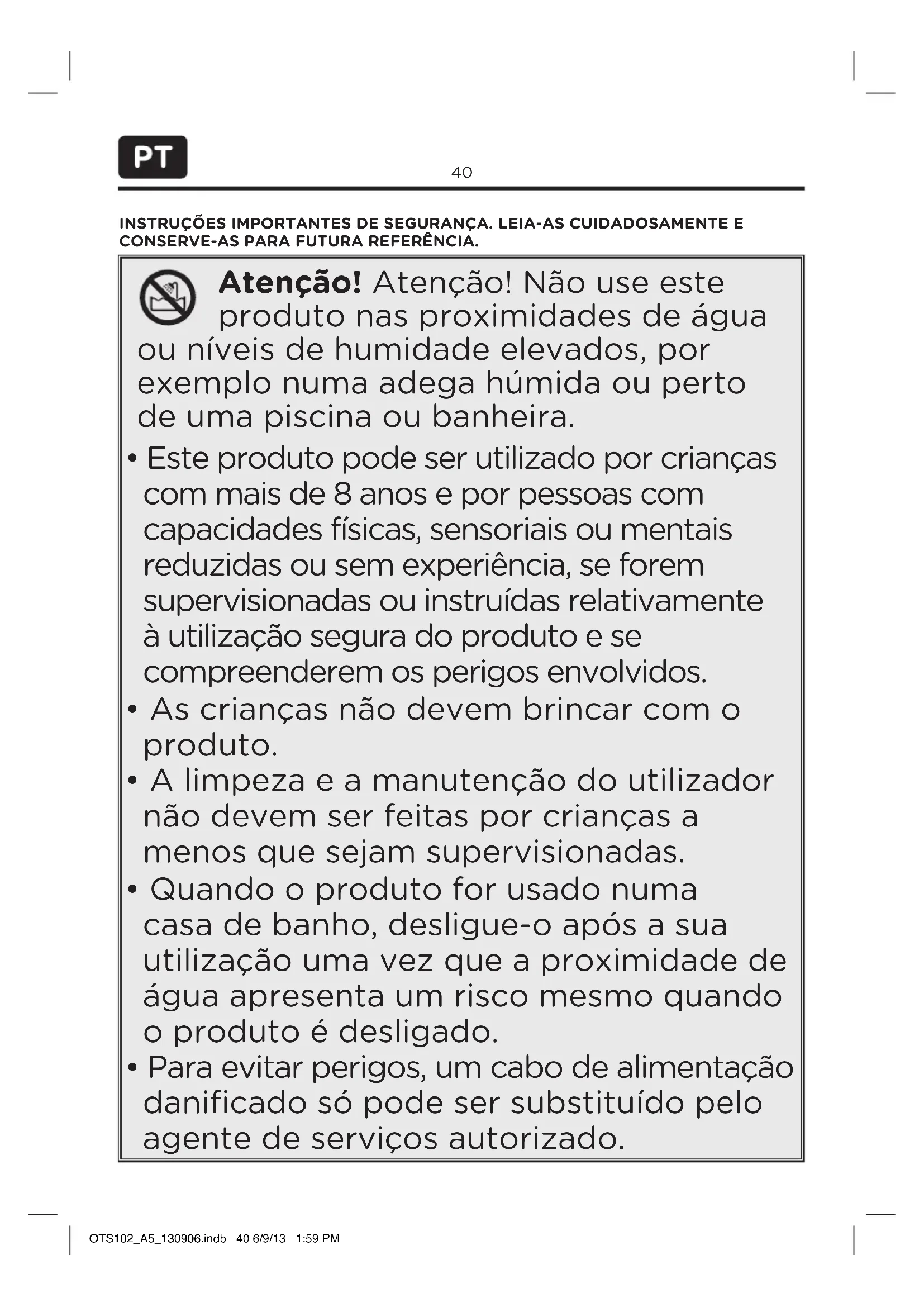 - Este produto pode ser utilizado por crianças com mais de 8 anos e por pessoas com capacidades físicas, sensoriais ou mentais reduzidas ou sem experiência, se forem supervisionadas ou instruídas relativamente à utilização segura do produto e se compreenderem os perigos envolvidos.