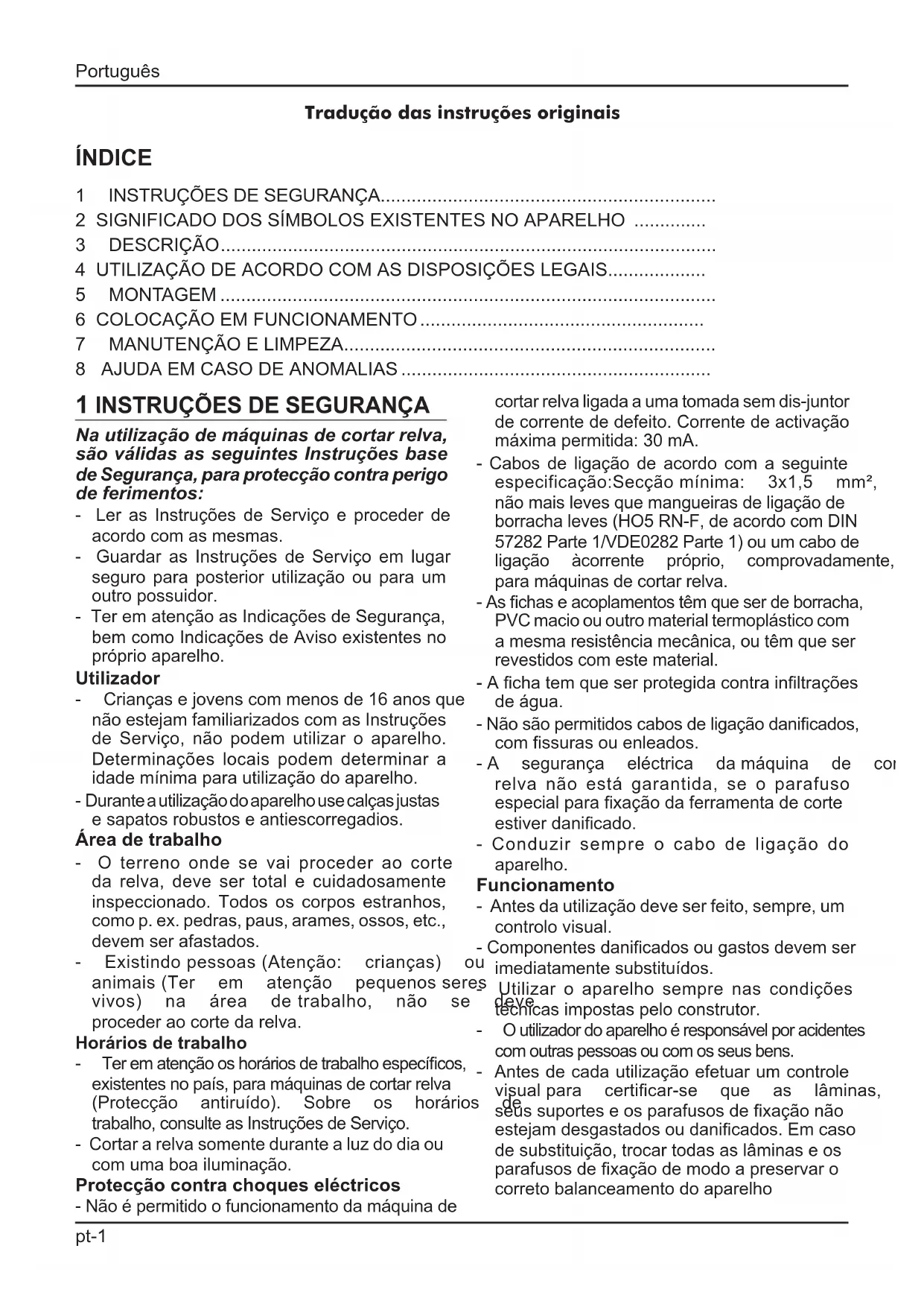 Na utilização de máquinas de cortar relva, são válidas as seguintes Instruções base de Segurança, para protecção contra perigo de ferimentos: - Ler as Instruções de Serviço e proceder de acordo com as mesmas. - Guardar as Instruções de Serviço em lugar seguro para posterior utilização ou para um outro possuidor. - Ter em atenção as Indicações de Segurança, bem como Indicações de Aviso existentes no próprioaparelho. Utilizador - Criançasejovenscommenosde16anosque não estejam familiarizados com as Instruções de Serviço, não podem utilizar o aparelho. Determinações locais podem determinar a idade mínima para utilização do aparelho. - Durante a utilização do aparelho use calças justas e sapatos robustos e antiescorregadios. Área de trabalho - O terreno onde se vai proceder ao corte da relva, deve ser total e cuidadosamente inspeccionado. Todos os corpos estranhos, como p. ex. pedras, paus, arames, ossos, etc., devem ser afastados. - Existindopessoas(Atenção: crianças) ou animais(Ter em atenção pequenosseres vivos) na área detrabalho, não se deve proceder ao corte da relva. Horários de trabalho - Terematençãooshoráriosdetrabalhoespecícos, existentesnopaís,paramáquinasdecortarrelva (Protecção antiruído). Sobre os horários de trabalho, consulte as Instruções de Serviço. - Cortar a relva somente durante a luz do dia ou com uma boa iluminação. Protecção contra choques eléctricos -Nãoépermitidoofuncionamentodamáquinade cortar relva ligada a uma tomada sem dis-juntor de corrente de defeito. Corrente de activação máximapermitida:30mA. - Cabos de ligação de acordo com a seguinte especificação:Secçãomínima: 3x1,5 mm², nãomaislevesquemangueirasdeligaçãode borrachaleves(HO5RN-F,deacordocomDIN 57282Parte1/VDE0282Parte1)ouumcabode ligação àcorrente próprio, comprovadamente, paramáquinasdecortarrelva. -Aschaseacoplamentostêmqueserdeborracha, PVC macio ou outro material termoplástico com amesmaresistênciamecânica,outêmqueser revestidos com este material. -Achatemqueserprotegidacontrainltrações de água. -Nãosãopermitidoscabosdeligaçãodanicados, comssurasouenleados. -A segurança eléctrica damáquina de cortar relva não está garantida, se o parafuso especialparaxaçãodaferramentadecorte estiverdanicado. - Conduzir sempre o cabo de ligação do aparelho. Funcionamento - Antes da utilização deve ser feito, sempre, um controlo visual. -Componentesdanicadosougastosdevemser imediatamente substituídos. - Utilizar o aparelho sempre nas condições técnicasimpostaspeloconstrutor. - Outilizadordoaparelhoéresponsávelporacidentes com outras pessoas ou com os seus bens. - Antes de cada utilização efetuar um controle visualpara certicar-se que as lâminas, os seussuporteseosparafusosdexaçãonão estejamdesgastadosoudanicados.Emcaso desubstituição,trocartodasaslâminaseos parafusosdexaçãodemodoapreservaro correto balanceamento do aparelho pt-1 Português Tradução das instruções originaisIndicação adicional às instruções de serviço do aparelho, capítulo «Para a sua segurança». Este aparelho não está preparado para ser utilizadoporpessoas(criançasincluídas) com capacidades físicas, sensoriais ou men- taislimitadasoucomfaltadeexperiênciae/ oudeconhecimentos,amenosquesejam vigiadas por uma pessoa responsável pela suasegurançaouquetenhamrecebido instruções desta pessoa de como o aparel- ho deve ser utilizado. As crianças devem servigiadas,parasegarantirqueelasnão brinquemcomoaparelho. Português - Nunca utilizar o cortador de grama se houver dispositivos de proteção defeituosos ou danificados e muito menos na ausência dos dispositivos de segurança como os deetoresouosacodecoleta - Pararomotoredesconectaratampadavela: - Antes de remover eventuais travamentos ou liberar o transportador -Apóssechocarcomumcorpoestranho - Se o aparelho iniciar a vibrar de maneira anômala - Manter todas as porcas e parafusos bem apertadosdemodoagarantirqueoaparelho esteja em condições de funcionar em segurança - Verificar freqüentemente que o saco de coleta não apresente traços de desgaste ou queestejadanicado - Desligaromotor,quandotiveremqueser atravessadas outras zonas diferentes da área para cortar a relva. - Não pôr o motor em funcionamento se se encontrar defronte do canal de expulsão (máquinadecortarrelvacomexpulsãolateral). - Utilizar a máquina de cortar relva só em superfícies relvadas. - Não colocar fora de serviço os dispositivos desegurançaedeprotecçãodamáquina de cortar relva. - Paraoarranquedamáquinadecortarrelva, aferramentadecortetemqueterumacesso completamente livre.Desacoplar eventuais accionamentos existentes. - Seamáquinadecortarrelvativerqueser levantada para entrar em funcionamento, o dispositivodecortetemqueestarapontado no sentido oposto ao do utilizador. - As mãos e os pés nunca devem estar próximosdeelementosemrotação. - Autilizaçãodamáquinadecortarrelvasóé permitida,mantendoadistânciadesegurança conseguidaatravésdalongarinadeguia. - Manter uma posição de segurança. -Nuncalevantaroutransportaramáquinadecortar relva com o motor em funcionamento. Esperar queodispositivodecorteestejacompletamente paradoedesligarachadatomada. - Cortar a relva sempre em posição transversal em relação à inclinação. Não utilizar amáquinadecortarrelvaeminclinaçõespara cimaeparabaixo,nemquandoasmesmas tiverem um declive superior a 15°. - Atenção na mudança de sentido de condução ouquandocortararelvaemmarchaatrás. -Conduziramáquinadecortarrelvasempre auma velocidade de passo. Nãodeixaramáquinade cortar relva sem vigilância. Manutenção e armazenamento Antesdequalquerintervençãonoaparelho: - Desligar o motor, esperar que a lâmina de corte esteja completamente parada e desligarachadatomada. -Casotenhaqueserfeitaalgumaintervenção nazonadalâminadecorte,utilizarluvasde protecção. -Nãomolharamáquinadecortarrelvacom água. - Reparações n