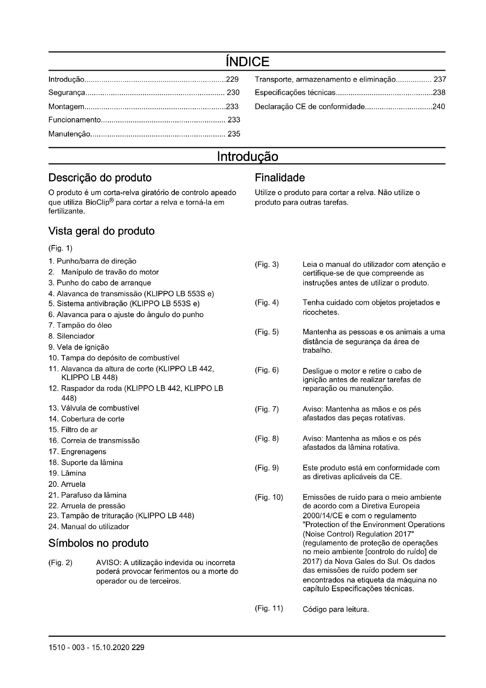 Símbolos no produto (Fig. 2) AVISO: A utilização indevida ou incorreta poderá provocar ferimentos ou a morte do operador ou de terceiros. (Fig. 3) Leia o manual do utilizador com atenção e certifique-se de que compreende as instruções antes de utilizar o produto. (Fig. 4) Tenha cuidado com objetos projetados e ricochetes. (Fig. 5) Mantenha as pessoas e os animais a uma distância de segurança da área de trabalho. (Fig. 6) Desligue o motor e retire o cabo de ignição antes de realizar tarefas de reparação ou manutenção. (Fig. 7) Aviso: Mantenha as mãos e os pés afastados das peças rotativas. (Fig. 8) Aviso: Mantenha as mãos e os pés afastados da lâmina rotativa. (Fig. 9) Este produto está em conformidade com as diretivas aplicáveis da CE. (Fig. 10) Emissões de ruído para o meio ambiente de acordo com a Diretiva Europeia 2000/14/CE e com o regulamento "Protection of the Environment Operations (Noise Control) Regulation 2017" (regulamento de proteção de operações no meio ambiente [controlo do ruído] de 2017) da Nova Gales do Sul. Os dados das emissões de ruído podem ser encontrados na etiqueta da máquina no capítulo Especificações técnicas. (Fig. 11) Código para leitura. 1510 - 003 - 15.10.2020 229Nota: Os restantes símbolos/autocolantes existentes no produto dizem respeito a requisitos para homologação em algumas áreas comerciais. Emissões Euro V ATENÇÃO: A adulteração do motor anula a aprovação deste produto pela UE. Responsabilidade pelo produto Como referido nas leis de responsabilidade pelo produto, não somos responsáveis por danos causados pelo nosso produto se:
