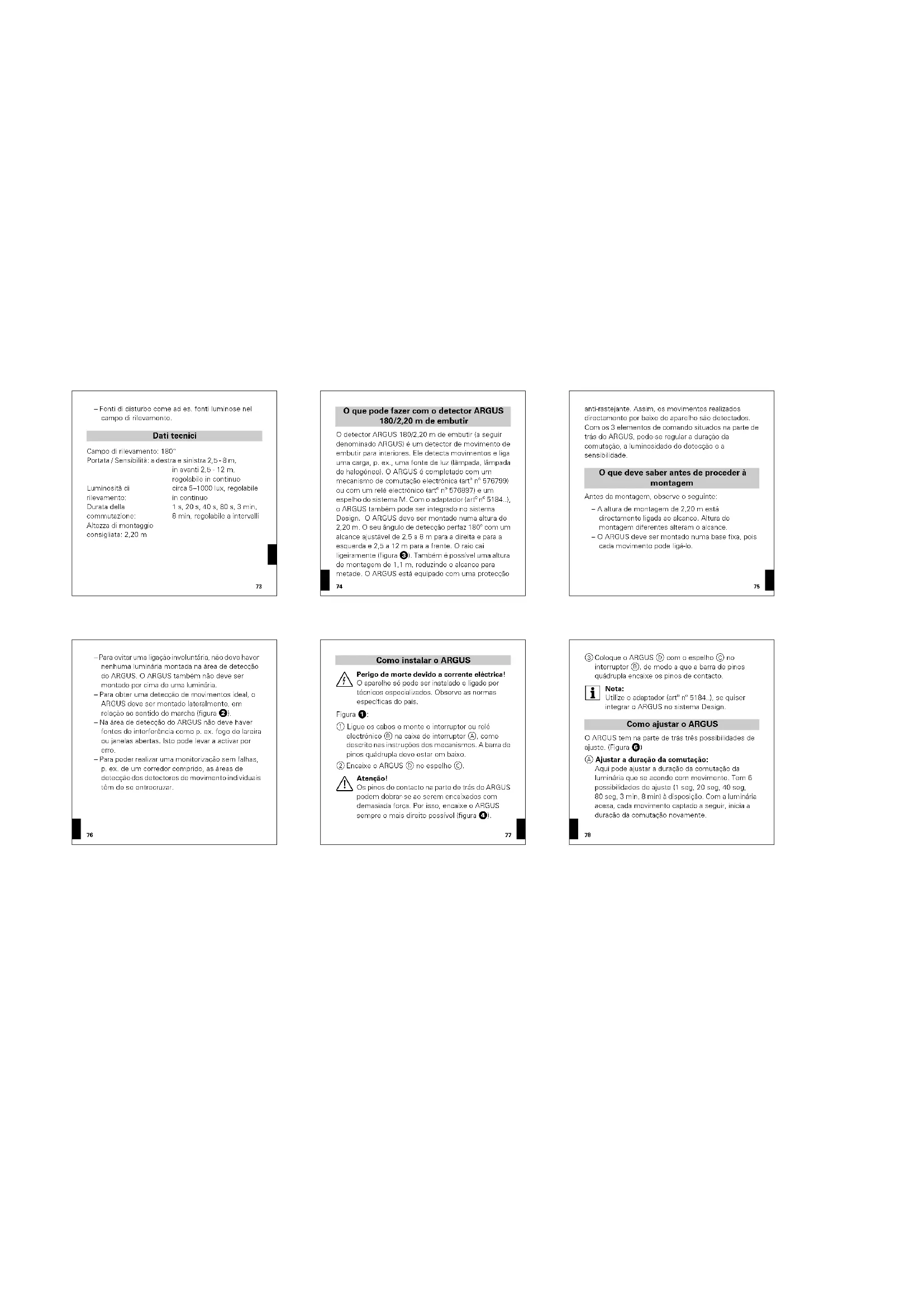 O detector ARGUS 180/2,20 m de embotir (a seguir denominacao ARGUS) é um detector motivos e embotir para interiores. Eie detecta movimento e liga umaarga, o. ex., uma fonte de luz lampa, umpa de halogeoneo. O ARGUS é completeness com um mecanismo de comutatione electronicora (st^)^n 576799 ou com um rela elettronico (ar"na 576897) e um espehlo daSYSTEMA. Co adatador (est"na) 5184.1, O ARGUS tambem pode ser integrado no systema Design. O ARGUS DEVE se montao numa alta de 2,20 m. O seu angulo de docecao periaz 180° com um acanca acajustivel de 2,5 a 8 m para a direita e para a esquerda o 2,5 a 12 m para a franco. O raio cai igreamente (figura).Tamento é possivel uma alta de montagem do 1,1 m, reduzindo o alcanco para metadro. O ARGUS está equipacion comuma protecao