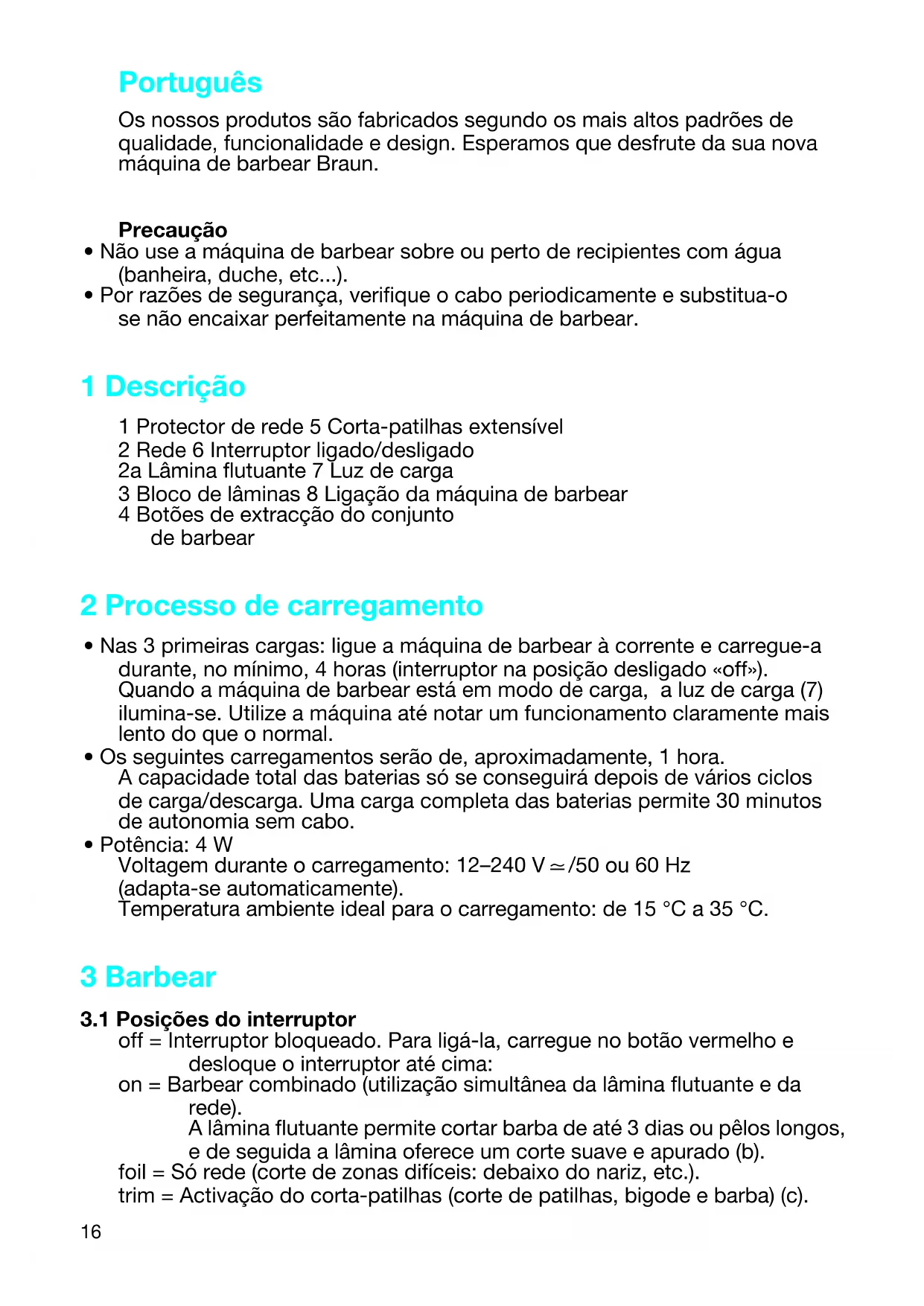 Os nossos produtos são fabricados segundo os mais altos padrões de qualidade, funcionalidade e design. Esperamos que desfrute da sua nova máquina de barbear Braun. Precaução