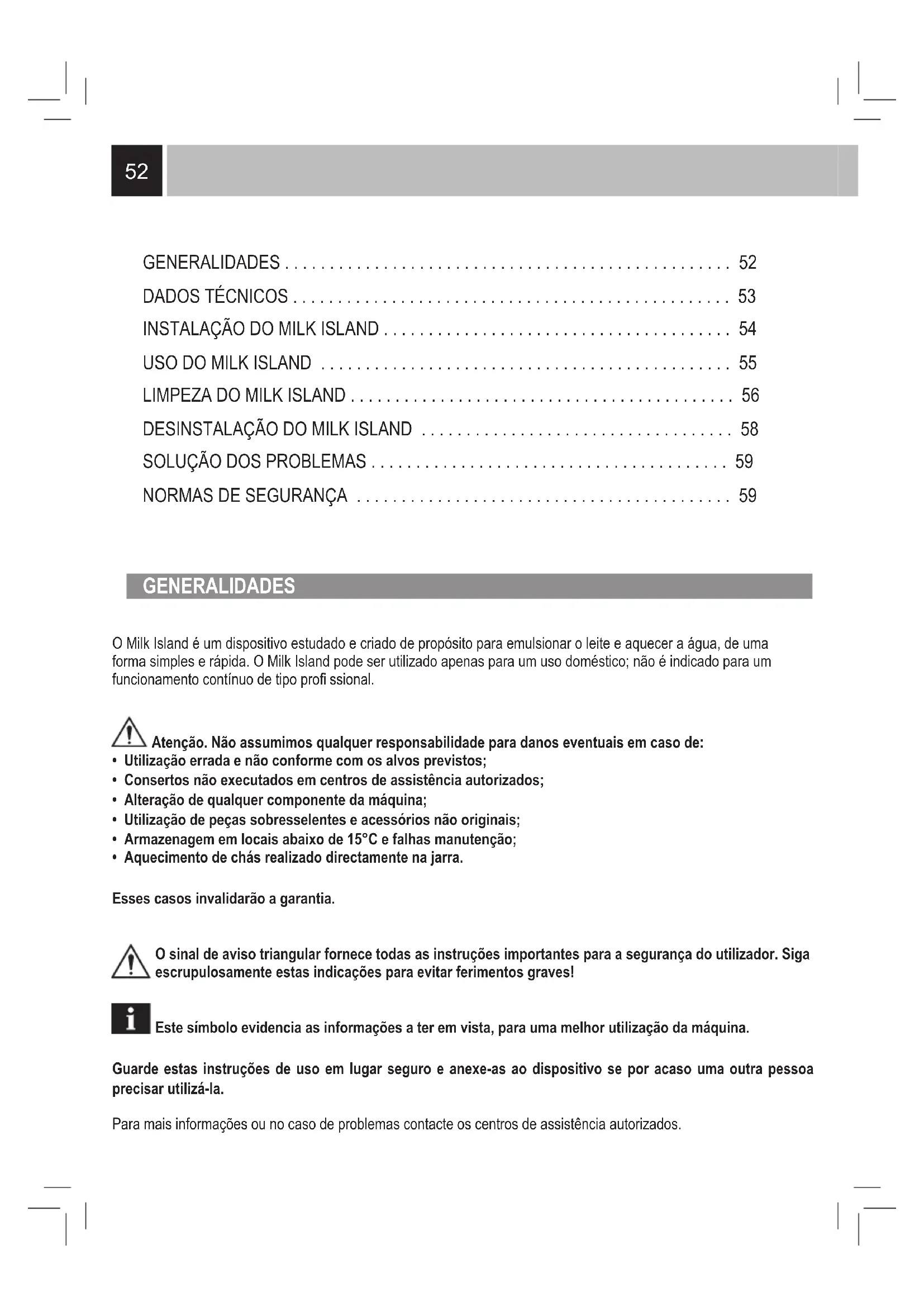 - Aquecimento de chás realizado directamente na jarra. Esses casos invalidarão a garantia. O sinal de aviso triangular fornece todas as instruções importantes para a segurança do utilizador. Siga escrupulosamente estas indicações para evitar ferimentos graves! Este símbolo evidencia as informações a ter em vista, para uma melhor utilização da máquina. Guarde estas instruções de uso em lugar seguro e anexe-as ao dispositivo se por acaso uma outra pessoa precisar utilizá-la. Para mais informações ou no caso de problemas contacte os centros de assistência autorizados. GENERALIDADES . . . . . . . . . . . . . . . . . . . . . . . . . . . . . . . . . . . . . . . . . . . . . . . . . . 52