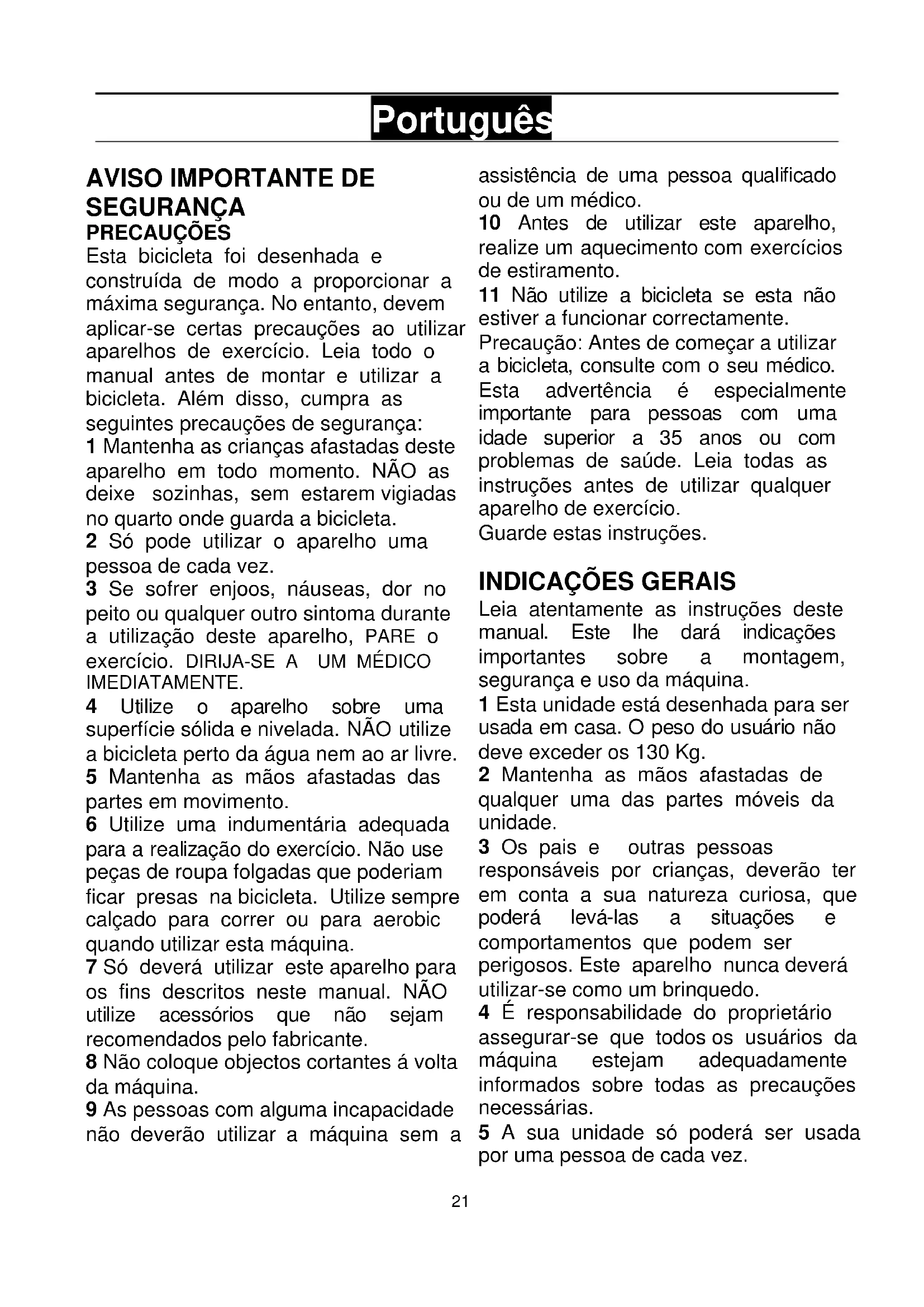 Precação: Antes devenir a usar a bicicleta, consulte com o seumedicalo.Esta advertência é especialmente importante para pessoas com uma idade superior a 35 anos ou com problemas de saude. Leia todas as instruções antes de utilizing qualquer aparelho de exercico.