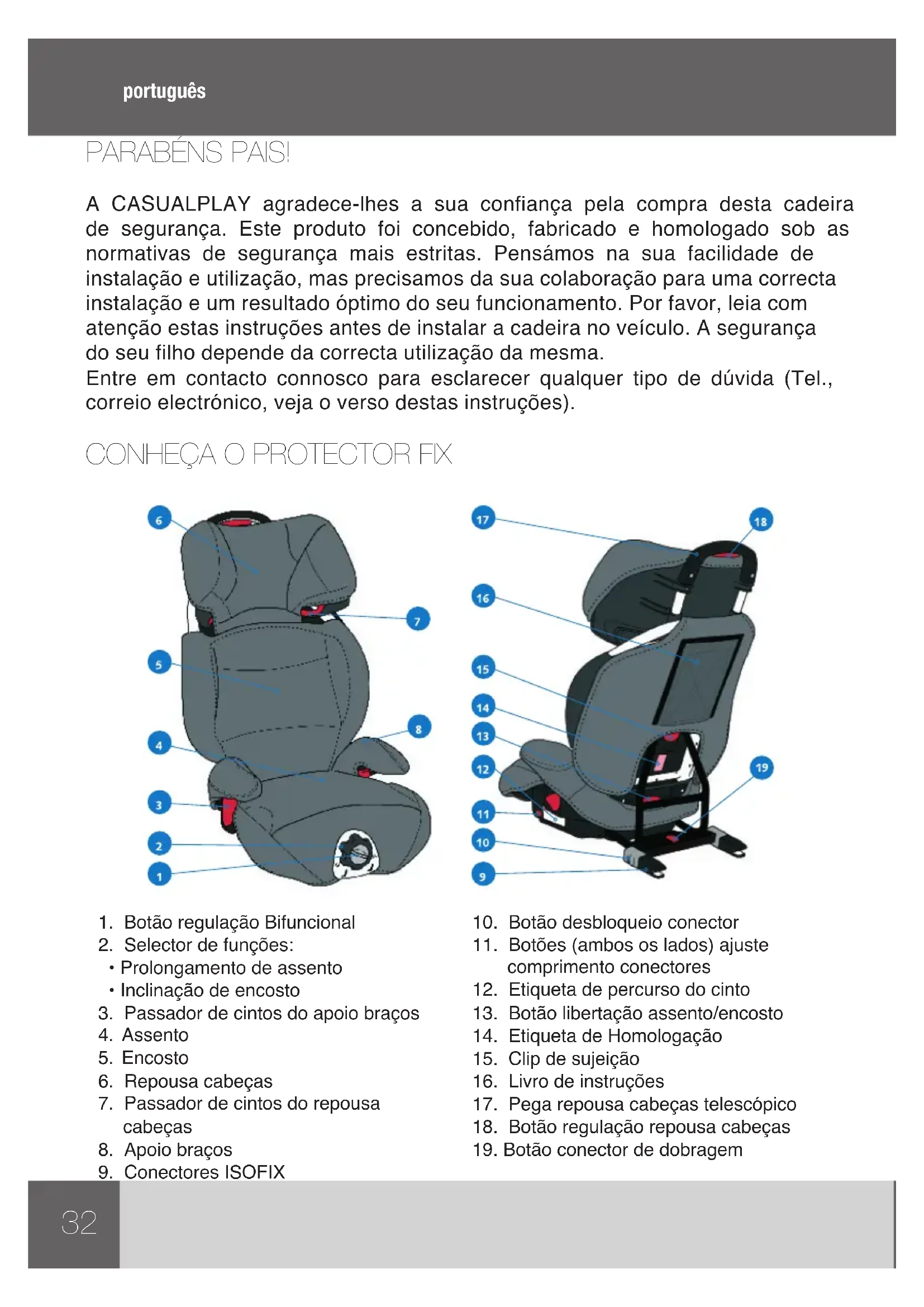 - Per il montaggio del rivestimento procedere al contrario.32 português PARABÉNS PAIS! A CASUALPLAY agradece-lhes a sua confiança pela compra desta cadeira de segurança. Este produto foi concebido, fabricado e homologado sob as normativas de segurança mais estritas. Pensámos na sua facilidade de instalação e utilização, mas precisamos da sua colaboração para uma correcta instalação e um resultado óptimo do seu funcionamento. Por favor, leia com atenção estas instruções antes de instalar a cadeira no veículo. A segurança do seu filho depende da correcta utilização da mesma. Entre em contacto connosco para esclarecer qualquer tipo de dúvida (Tel., correio electrónico, veja o verso destas instruções).