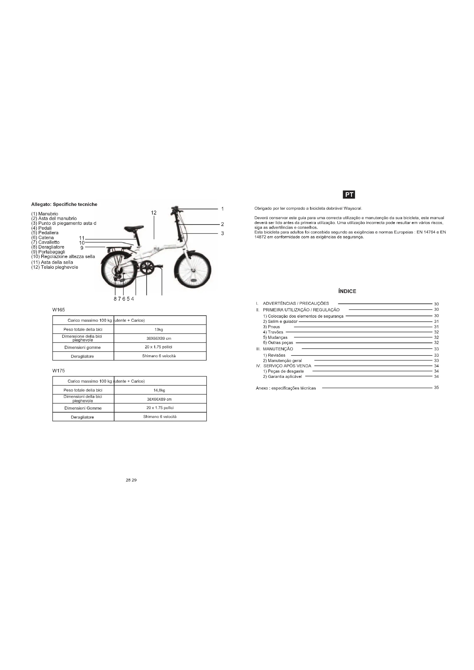 - 1 Ano para as peças, excepto de desgaste (pneus, câmara de ar, pastilhas de travão, manetas, selim, cabos). Para reclamar a garantia o utilizador deve apresentar o produto ao distribuidor, acompanhado com o talão de caixa ou factura. Esta garantia, aplica-se no país de compra, cobre os defeitos de fabrico que não permitam uma utilização normal. Não cobre defeitos provocados por uma má manutenção, utilização inapropriada, ou se as recomendações do fabricante não foram respeitadas. A garantia não cobre o desgaste provocado pelo uso normal do produto. Garantia: 12 Avenue des Morgines - 1213 Petit Lancy / Geneva - SWITZERLAND Anexo : Características técnicas (1) Guiador (2) Suporte guiador (3) Dobragem do suporte volante (4) Pedais (5) Pedaleira (6) Corrente (7) Descanso (8) Desviador (9) Porta-bagagem (10) Regulação de altura do selim (11) Espigão (12) Quadro dobrável W165 Carga máxima 100 kg (utilizador + Carga) Peso total da bicicleta 13kg 38X66X89 cm20 x 1.75 polegadas Shimano 6 velocidades Dimensão da bicicleta Dimensão Pneus Desviador W175 Carga máxima 100kg ( Usuario + Carga) Peso total de la bicicleta 14,8kg38X66X89 cm20 x 1.75 pulgadas Shimano 6 Velocidades Dimensão da bicicleta Dimensão Pneus Desviador