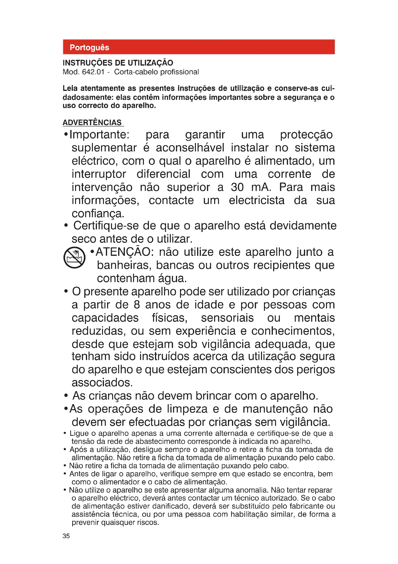 Mod. 642.01 - Corta-cabelo profissional Leia atentamente as presentes instruções de utilização e conserve-as cui- dadosamente: elas contêm informações importantes sobre a segurança e o uso correcto do aparelho. ADVERTÊNCIAS